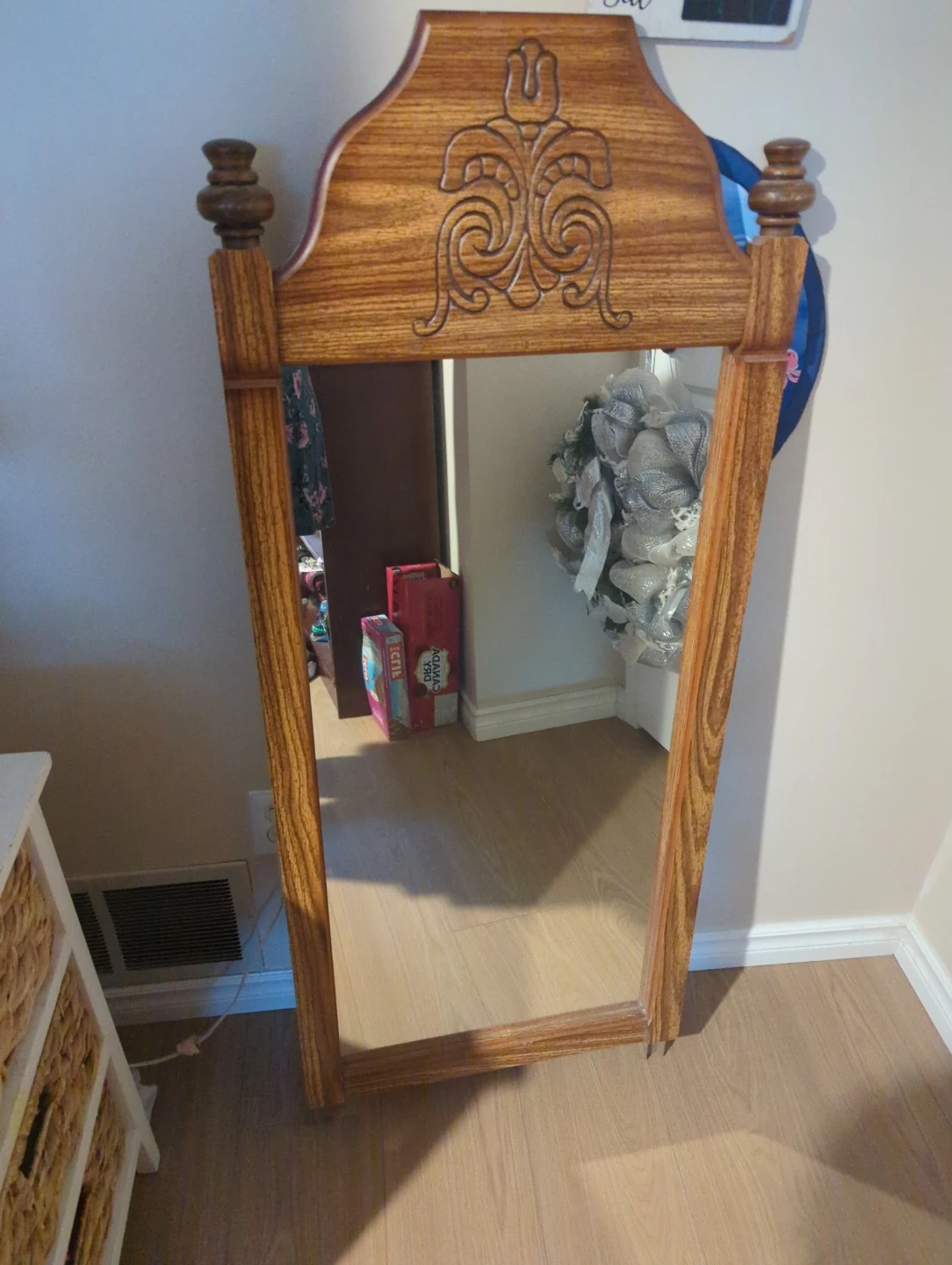 Here's a lovely wooden framed mirror! It has a beautiful carved design at the top. Perfect for adding a touch of warmth to any room