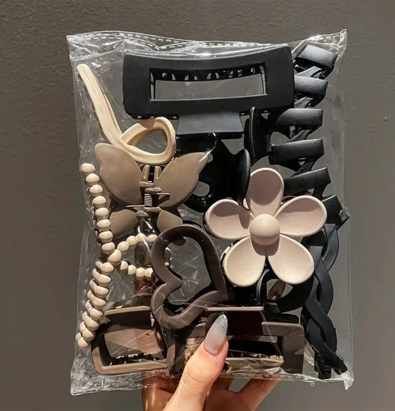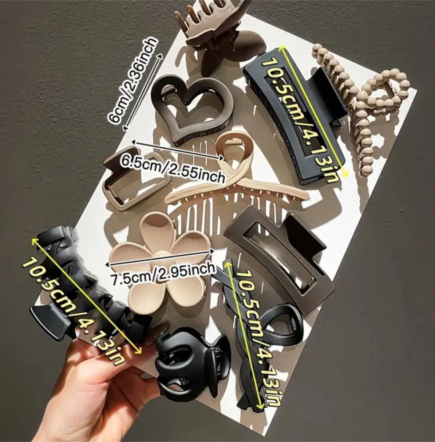 A set of 11 hair claw clips in black and brown colours. Includes various shapes and sizes.