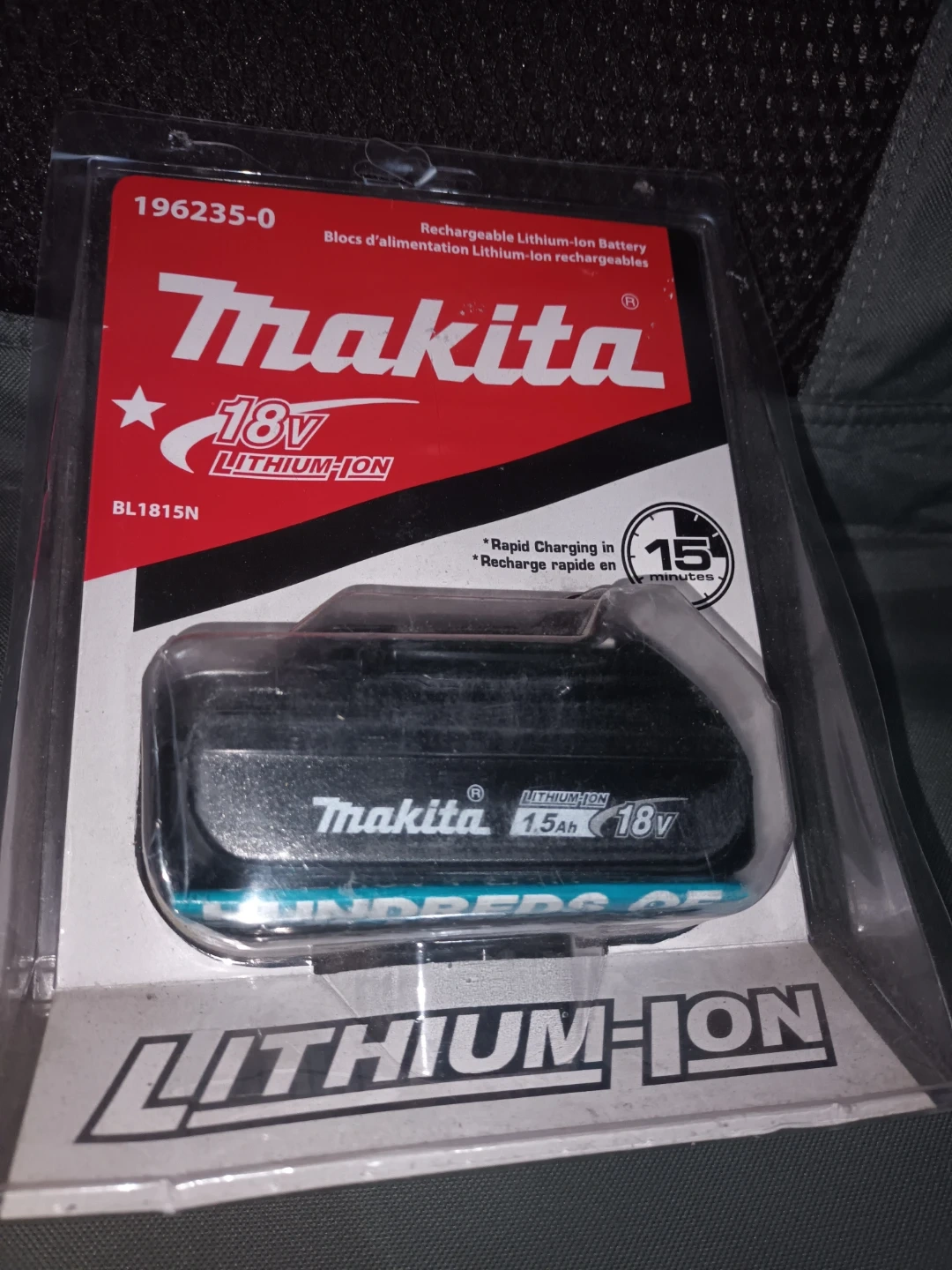 Selling a brand new Makita 18V 1.5Ah Lithium-Ion battery (model BL1815N). It's a rechargeable battery, perfect for your Makita power tools. It features rapid charging in just 15 minutes!
