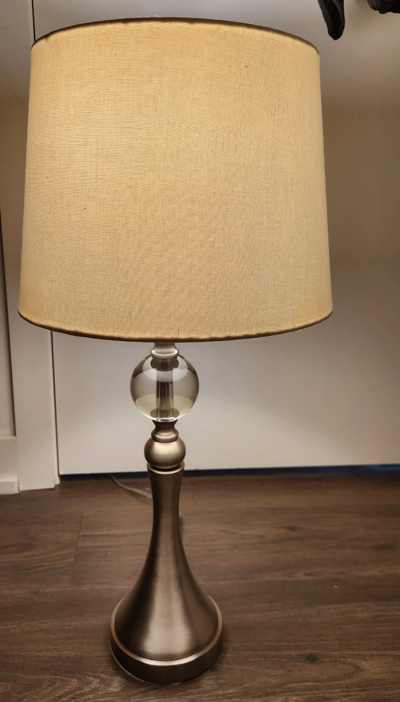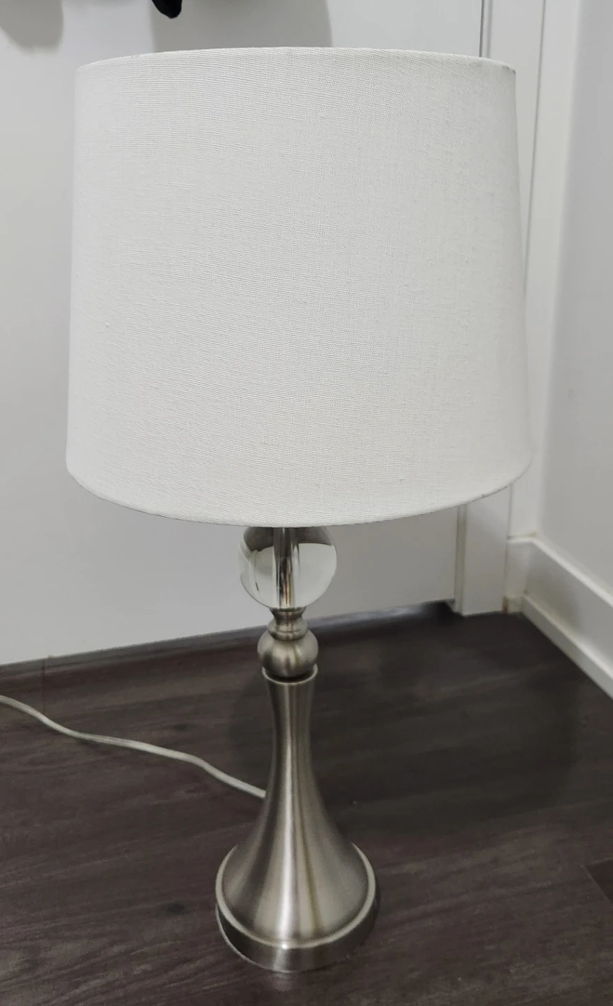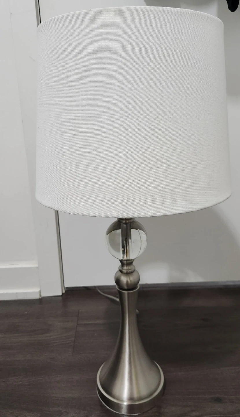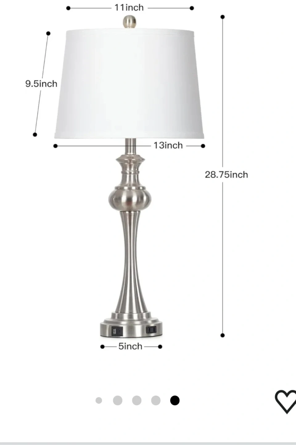 This is a stylish table lamp that would look great in any room! It features a white shade and a decorative base. The lamp stands 28.75 inches tall, with the shade measuring 11 inches in diameter at the top and 13 inches at the bottom.