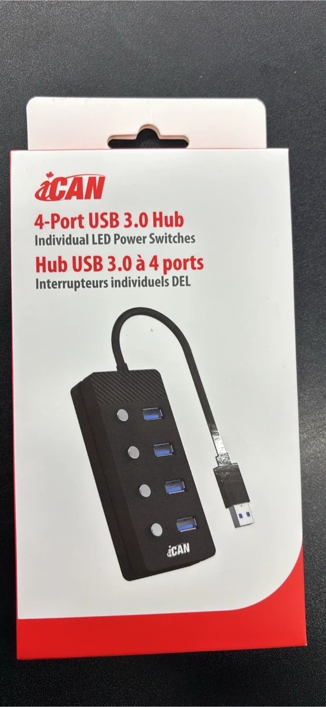 Selling a brand new ICAN 4-Port USB 3.0 Hub! It comes in its original box and features individual LED power switches.