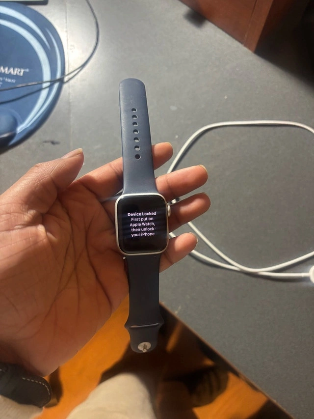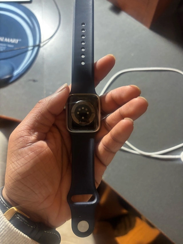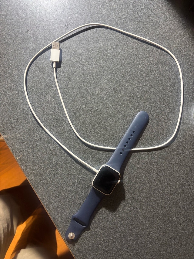 I am selling a used Apple Watch Series 6 GPS, 40mm with a silver aluminum case and a deep navy band. The watch is in good condition and gently used, but it is currently locked. You'll need to match the Apple Watch to your iPhone and then unlock your iPhone to be able to use it. * Model: Series 6 GPS * Case Size: 40mm * Case Material: Silver Aluminum * Band Colour: Deep Navy Looking at similar listings , I've priced this competitively. If you're still seeing this ad, the Apple Watch is available!