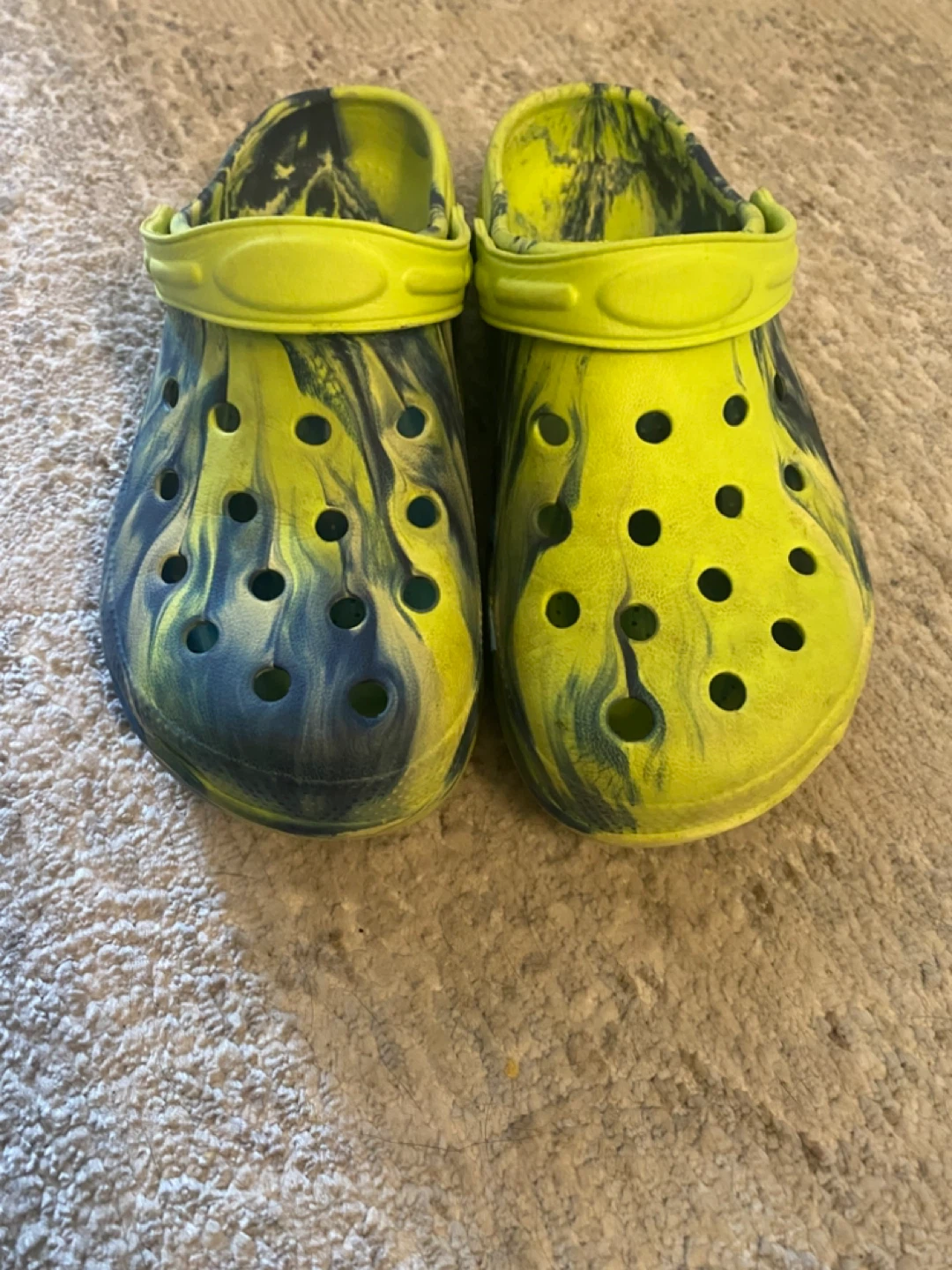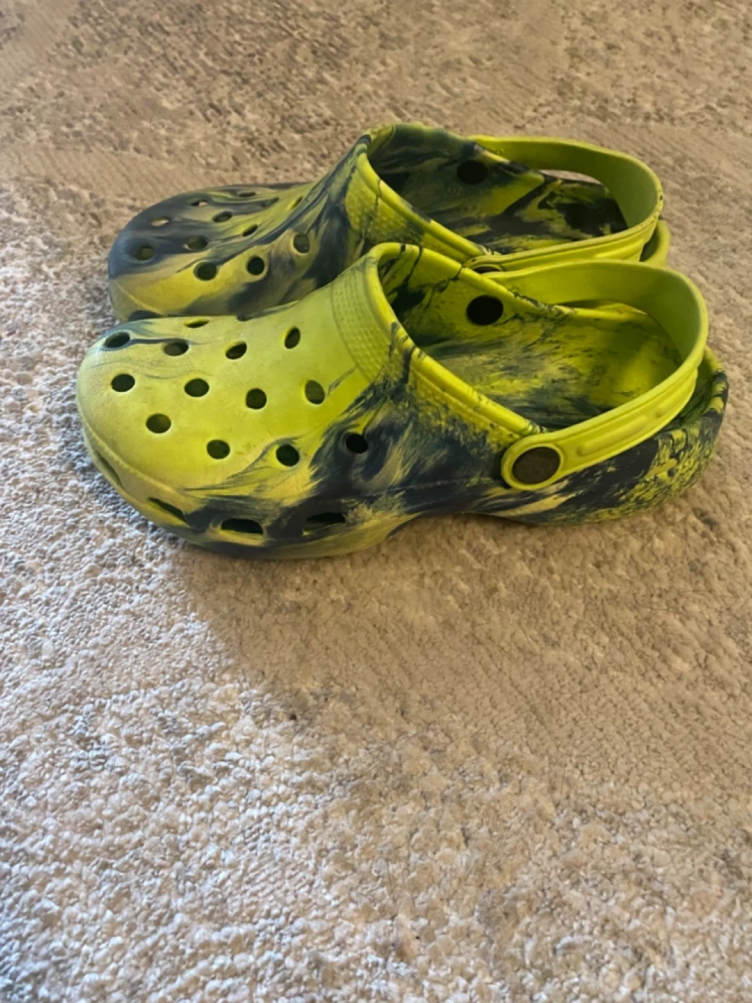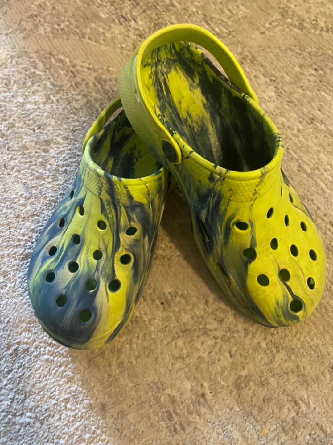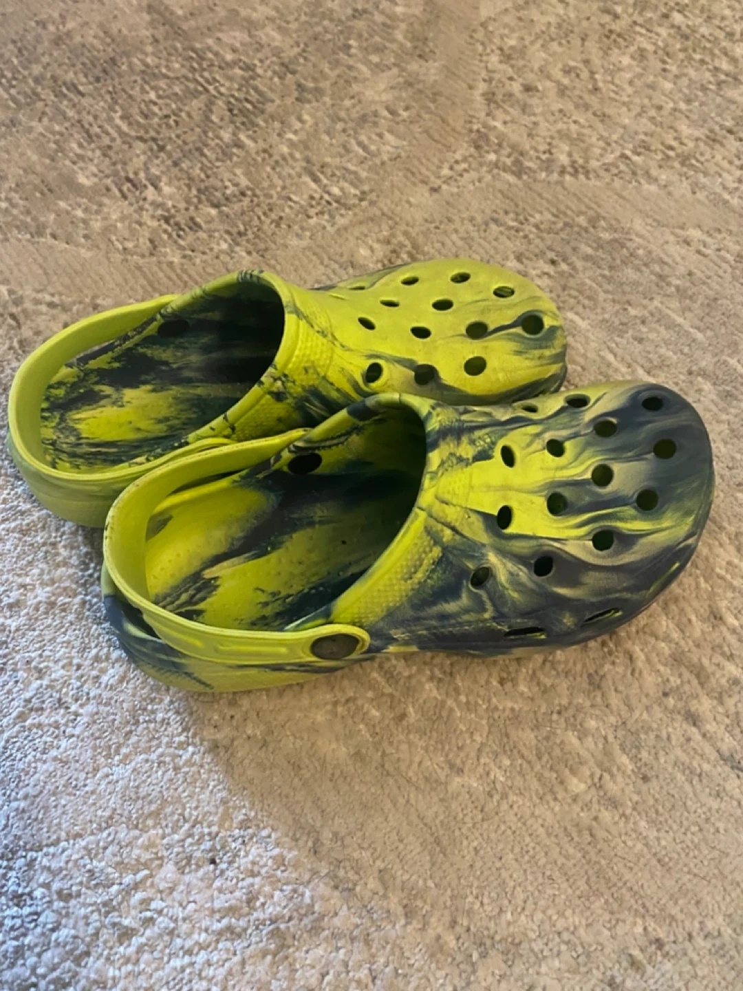 Selling a pair of Crocs Classic clogs in a cool green and blue marble pattern. They're a size 4. they're still in great condition and ready for a new adventure!