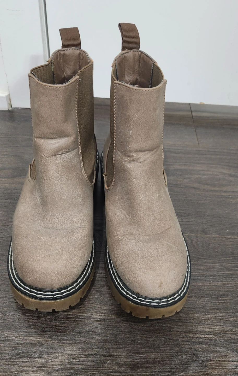 Selling a pair of Chelsea boots in size 6. They have a neutral, earthy tone and are in good condition. Perfect for everyday wear!