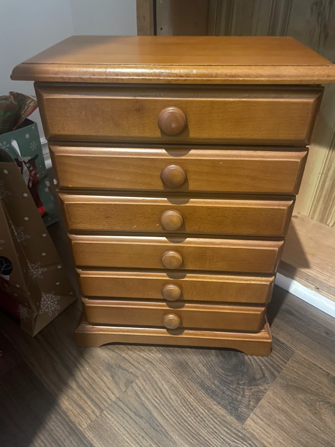 Here's a wooden dresser with six drawers! It's a great piece for extra storage in any room of your craft room