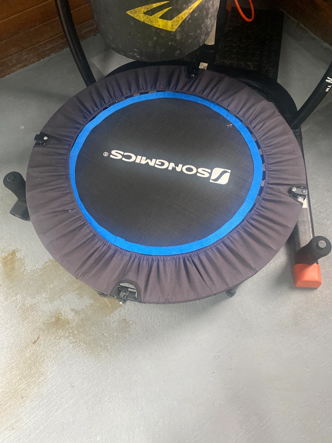 Selling a SONGMICS mini trampoline! This trampoline is great for low-impact exercise at home. It features a black jumping surface with a blue trim and a grey cover. Perfect for getting a light workout in any space