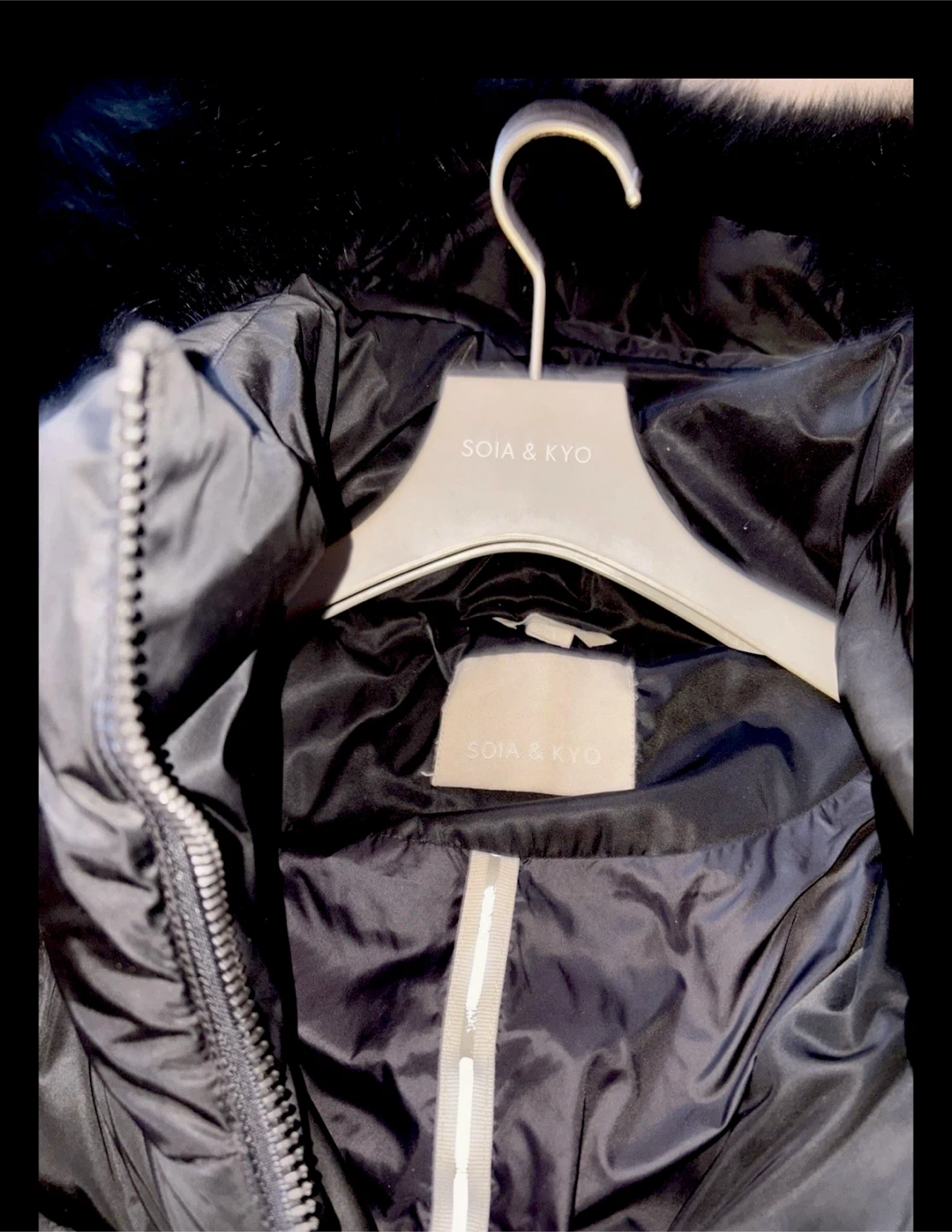 Cozy black down coat from Soia & Kyo. It's in great condition and ready for winter weather!new real fur