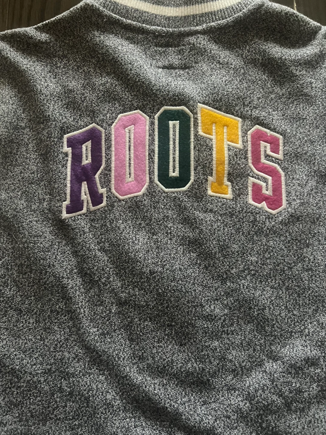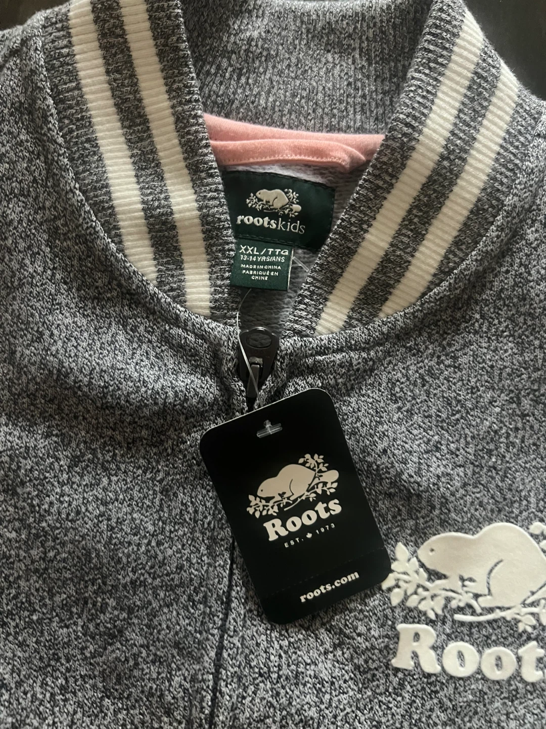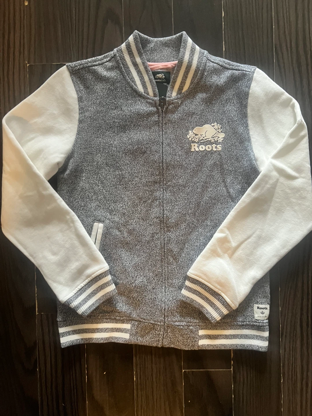 Roots Kids varsity jacket in size XXL! The jacket is grey with white sleeves and has the Roots logo on the front and back. Perfect for keeping your little one warm and stylish.
