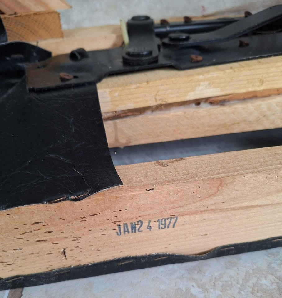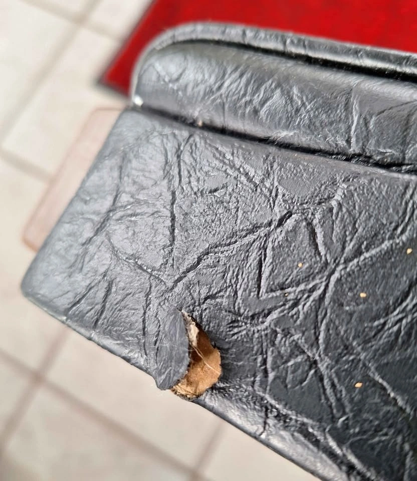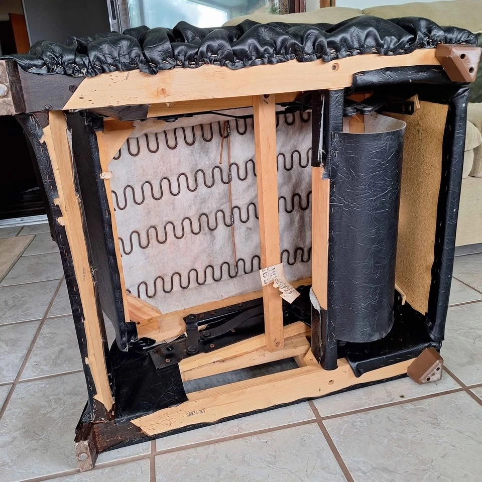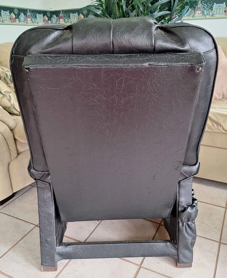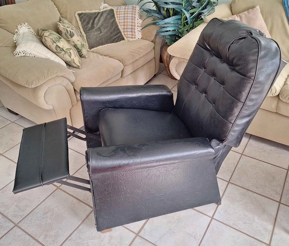 Vintage black leather look vinyl recliner from mid 1970's. Reclining mechanism in new condition, smooth recline, no creaking and only 1 tear on lower front leg as seen in picture. Has side pocket, 2 recline positions, comfortable and soft seat, and springs are 50 years so you get slight sinking as expected.