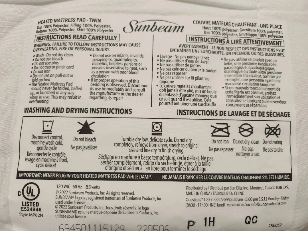 Selling a Sunbeam heated mattress pad for a twin bed. It's made with 100% polyester. Please read the instructions carefully to avoid overheating, fire, or personal injury. Washing and drying instructions are included as well.