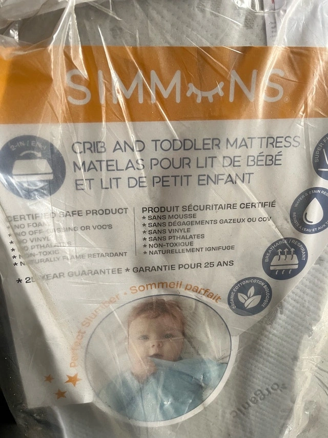 I'm selling a new Simmons baby crib and toddler mattress, still in its original packaging. It's a 2-in-1 design, certified safe, and made with organic cotton. Perfect for a good night's sleep for your little one!