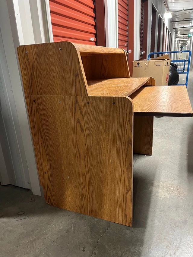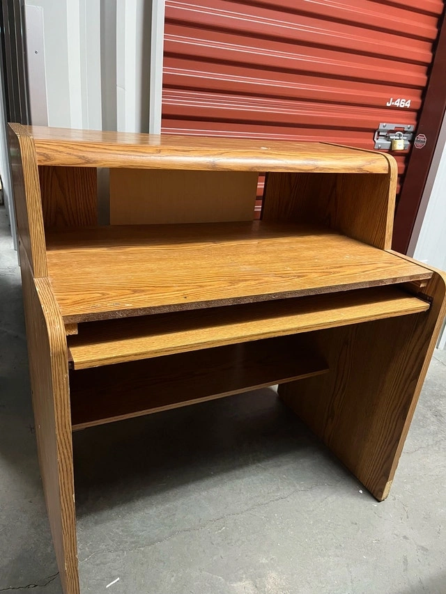 Used computer desk with a slide-out keyboard tray and an upper shelf for extra storage. Measures 36.5” x 38.5” x 23.5”. Perfect for a home office or study space, providing a compact workstation solution. Features include: