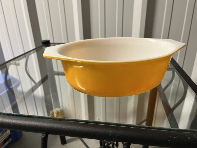 Pyrex Casserole Dish, perfect for your baking needs! The dish is used and in great condition, ready for a new home. The vibrant yellow colour adds a pop of sunshine to your kitchen. * Oval shape * Yellow exterior * Classic Pyrex design If the ad's still up, it's still available!