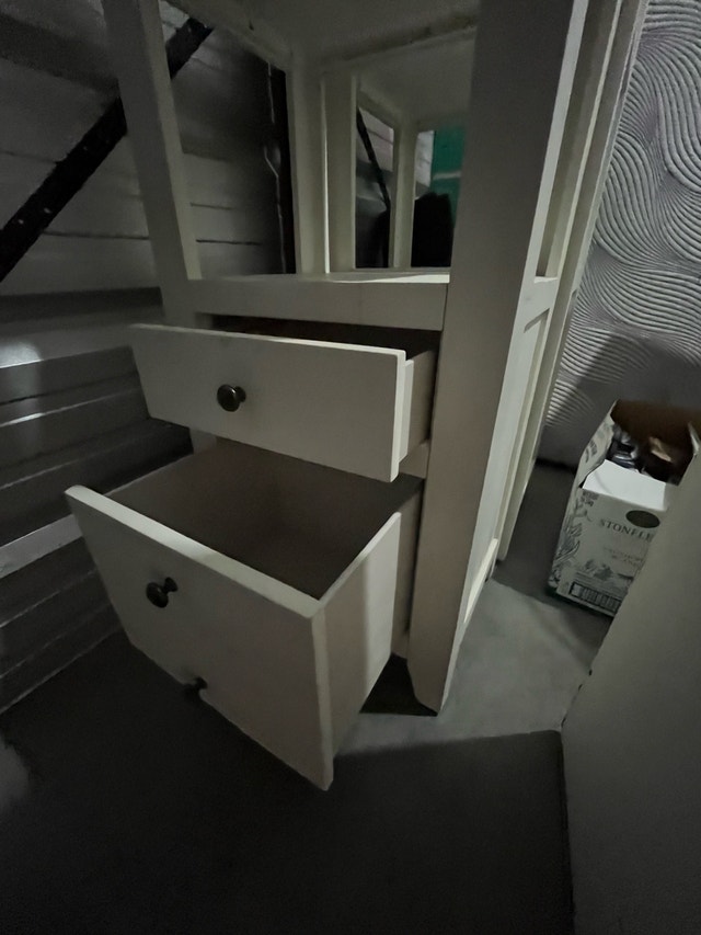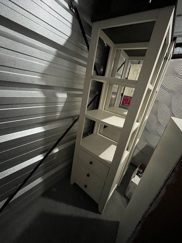 White with wood accent shelf, measuring 21” x 17” x 6ft, offer versatile storage solutions for any room. There are 2 at $150 each. The shelf features a combination of open shelving and drawers, perfect for displaying items or concealing clutter. These shelves are used, and remain sturdy and functional. Specifications: