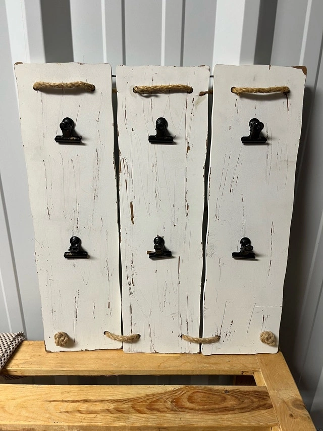 Display your cherished memories with this rustic wooden picture holder, perfect for adding a touch of country charm to any room. This used picture holder features three distressed white panels, each equipped with two black clip attachments and decorative jute rope accents. Additional features include: