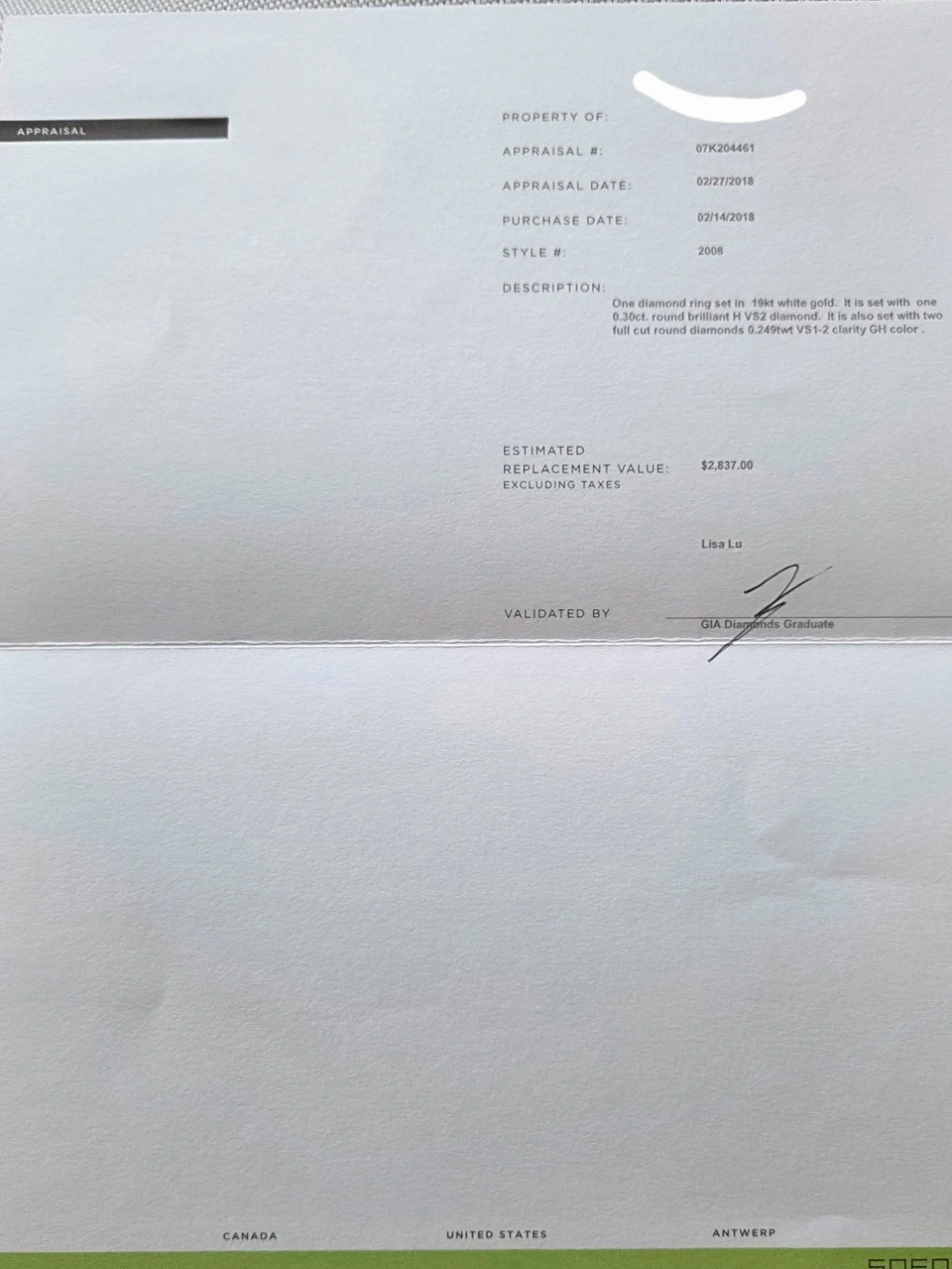 Selling a beautiful Spence diamond ring set in 19kt white gold. It features one 0.38ct round brilliant H VS-2 diamond, and two 0.249kt full cut round diamonds with GH color and VS1-2 clarity. The estimated replacement value is $2,837. Comes with the original box