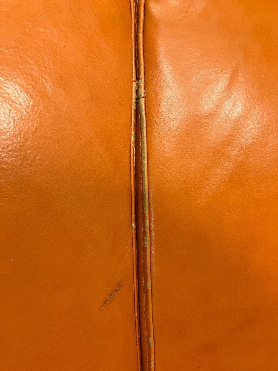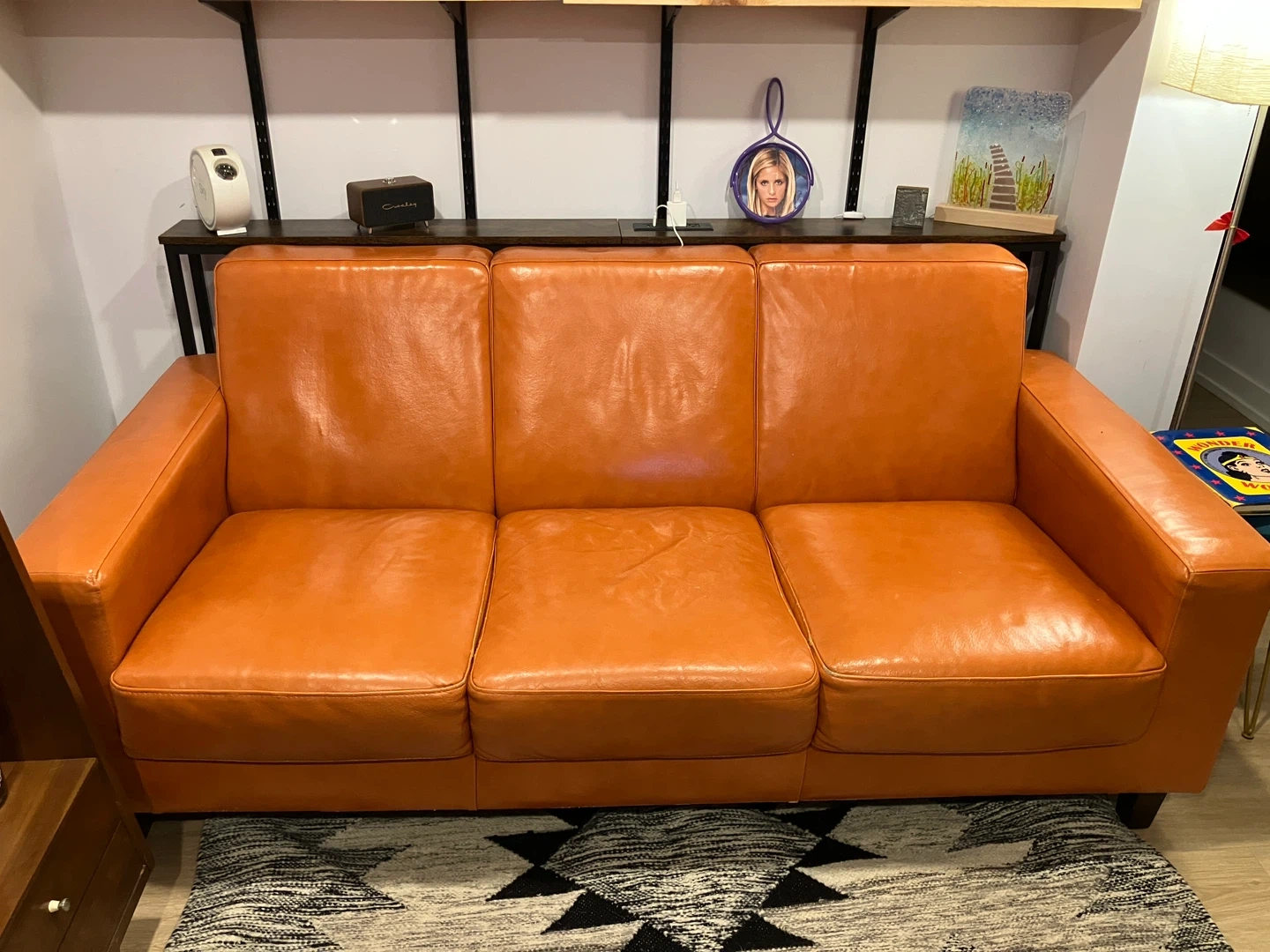 Selling a comfy orange leather sofa. There are some signs of wear and tear, as shown in the photos, but it's still got plenty of life left. It would be a great addition to any living room or den