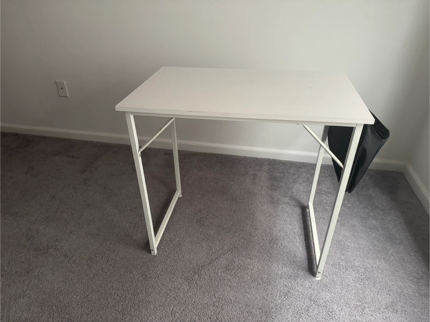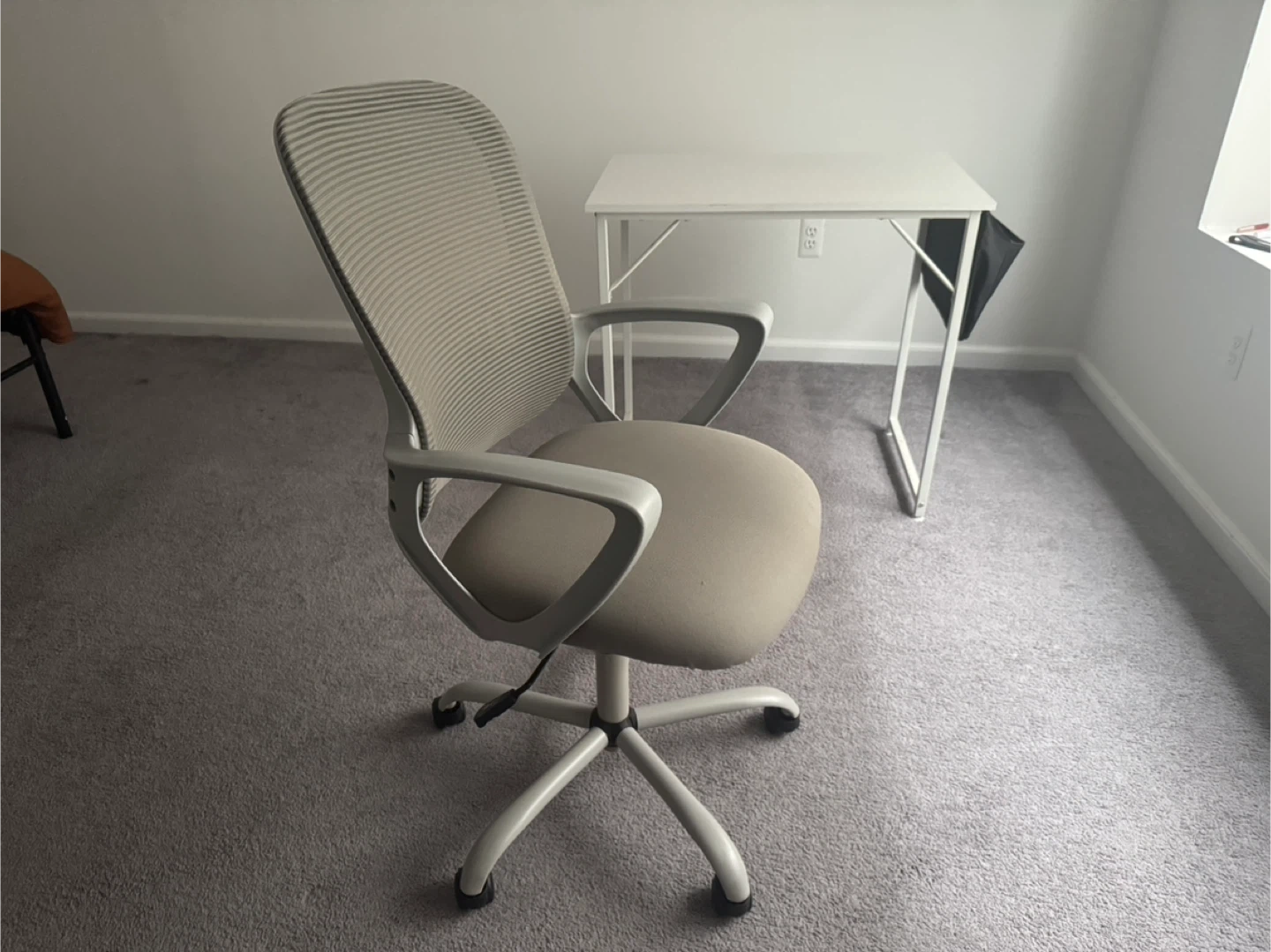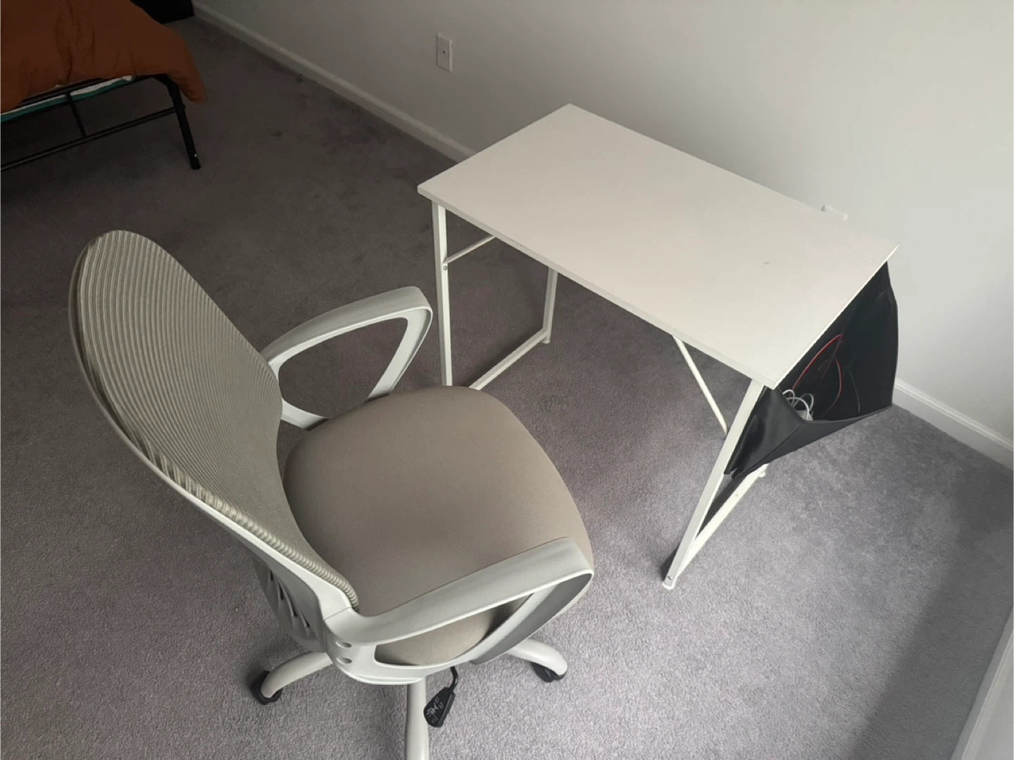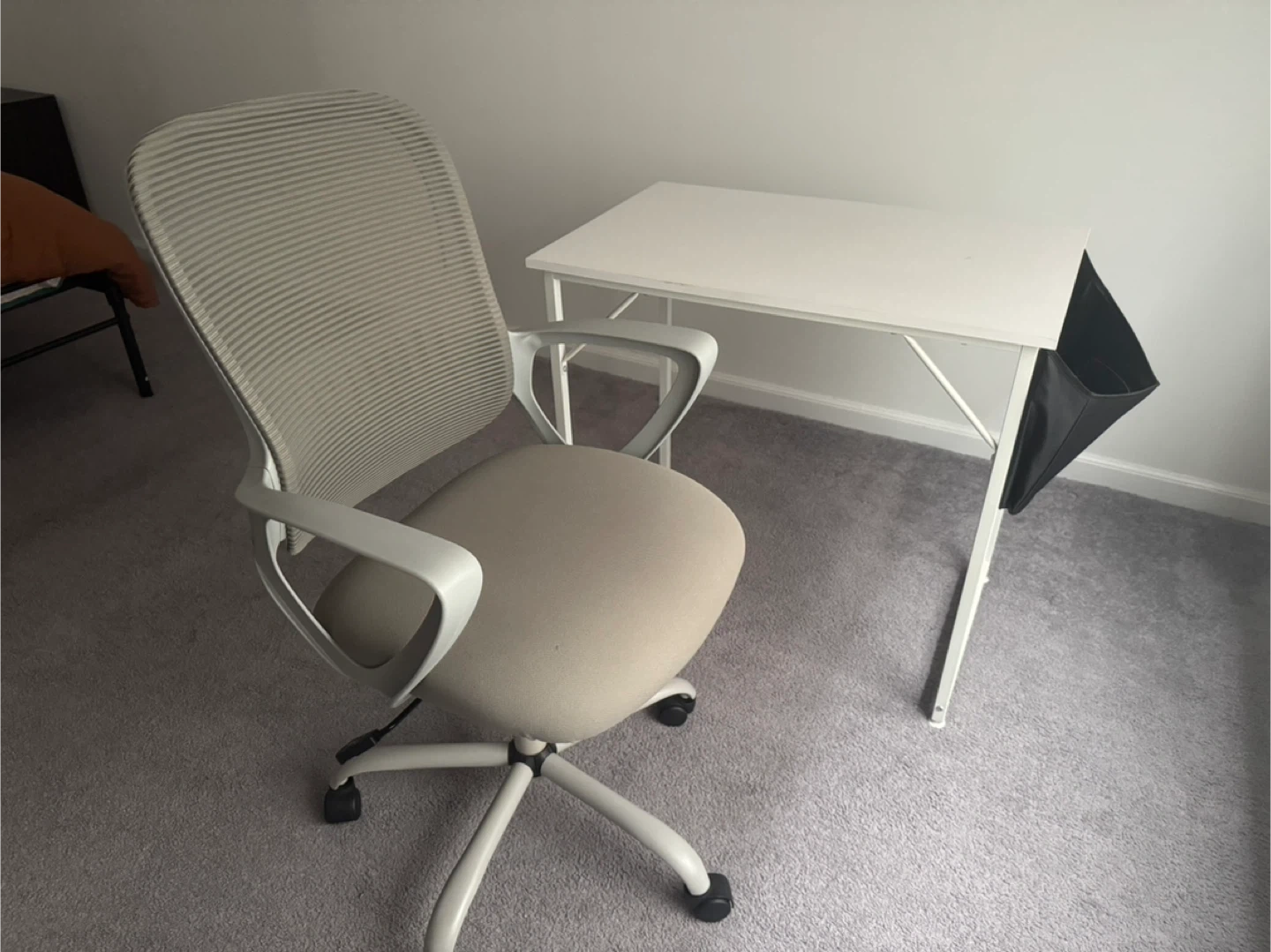 Selling a simple white desk and an ergonomic chair. The desk comes with a side pouch to hold laptop accessories. Both products are in great shape and perfect for a small space or as a temporary workstation. You could also purchase just one of the two offering in this ad.