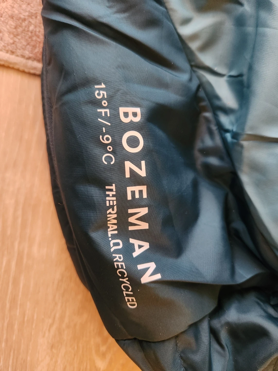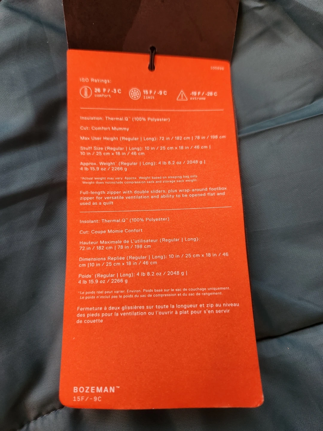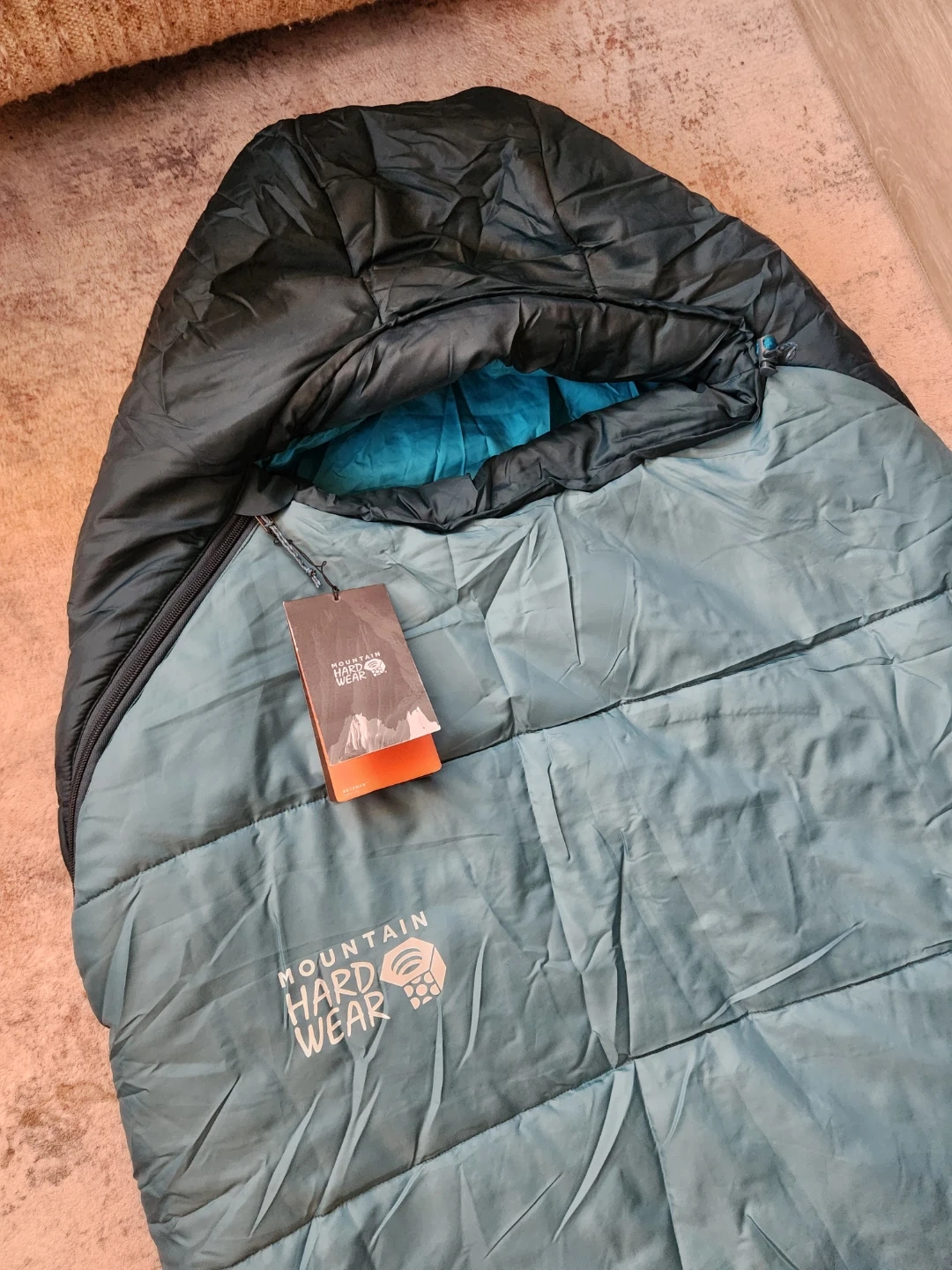 Selling a Mountain Hardwear Bozeman sleeping bag, rated to 15F/-9C. This sleeping bag features Thermal.Q recycled insulation and a full-length zipper with double sliders. It's designed for a comfortable mummy cut. Used a single time, basically new.