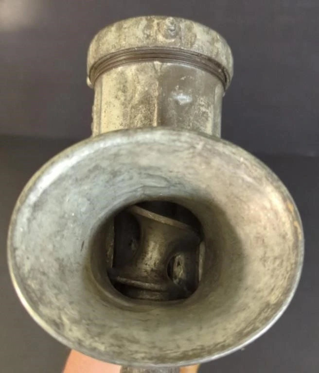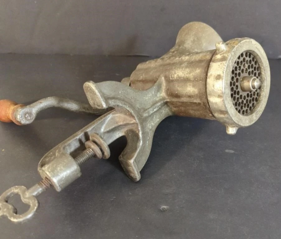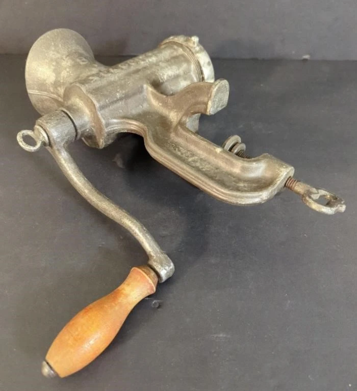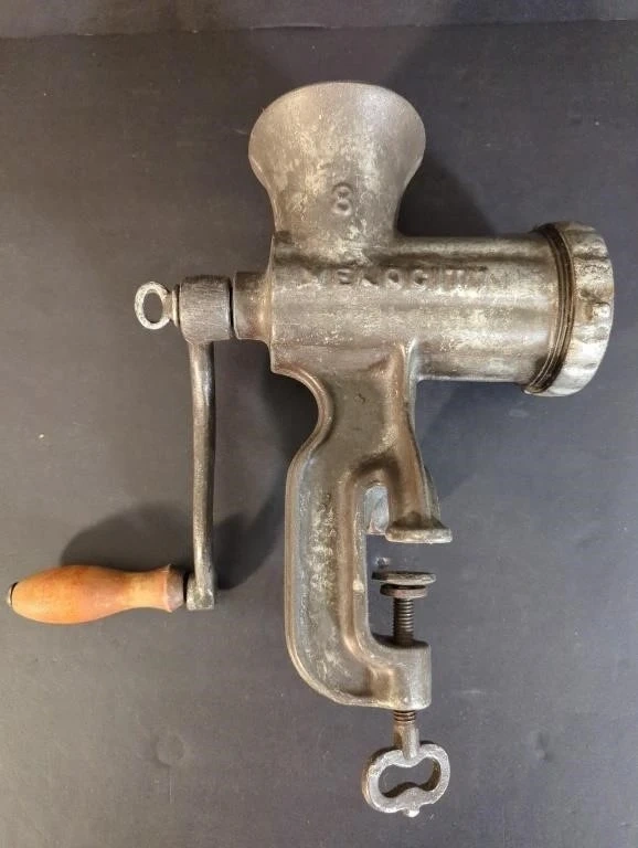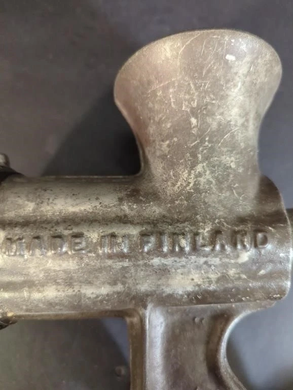 Selling a vintage Menoguin hand crank meat grinder. It is marked "Made in Finland" and has a wooden handle. Great for making your own ground meat at home!