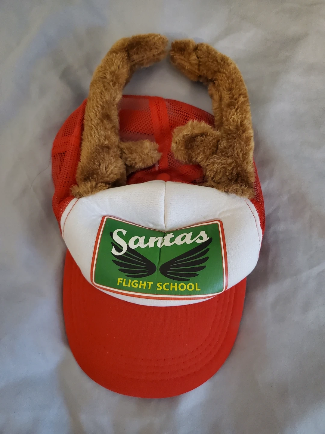 Selling a fun Santa's Flight School hat! It's red with a white front panel and has cute reindeer antlers attached. Perfect for the holidays or any fun occasion