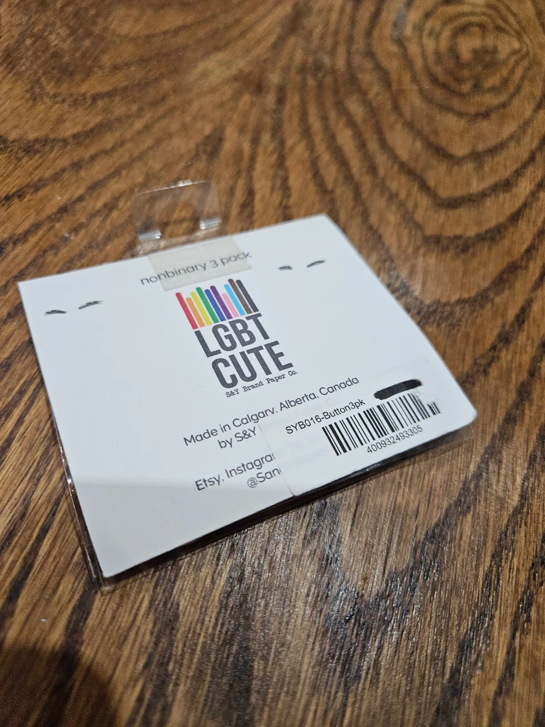 A set of three nonbinary-themed pins, great as a small gift for your non-binary friends! Unopened.