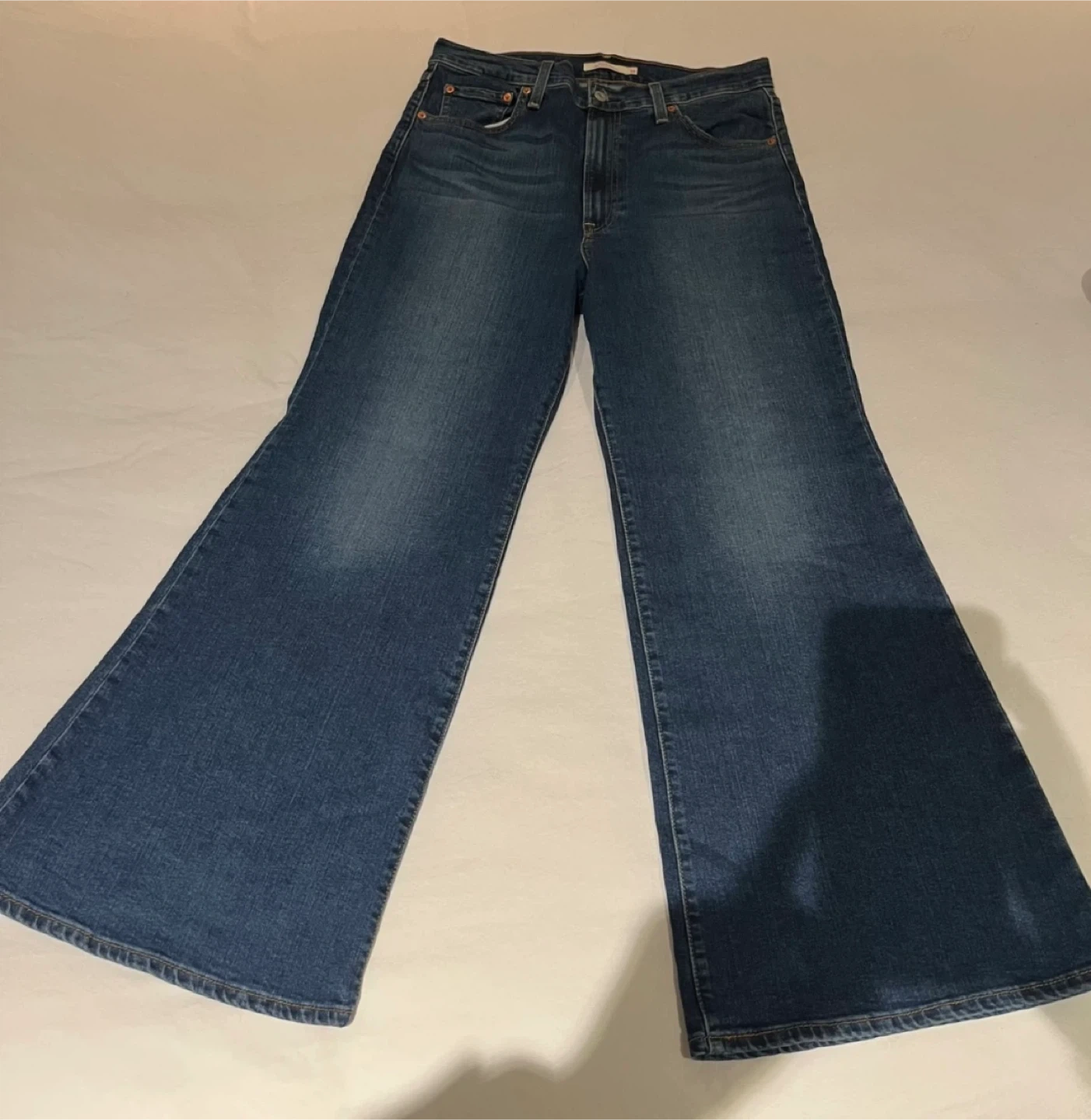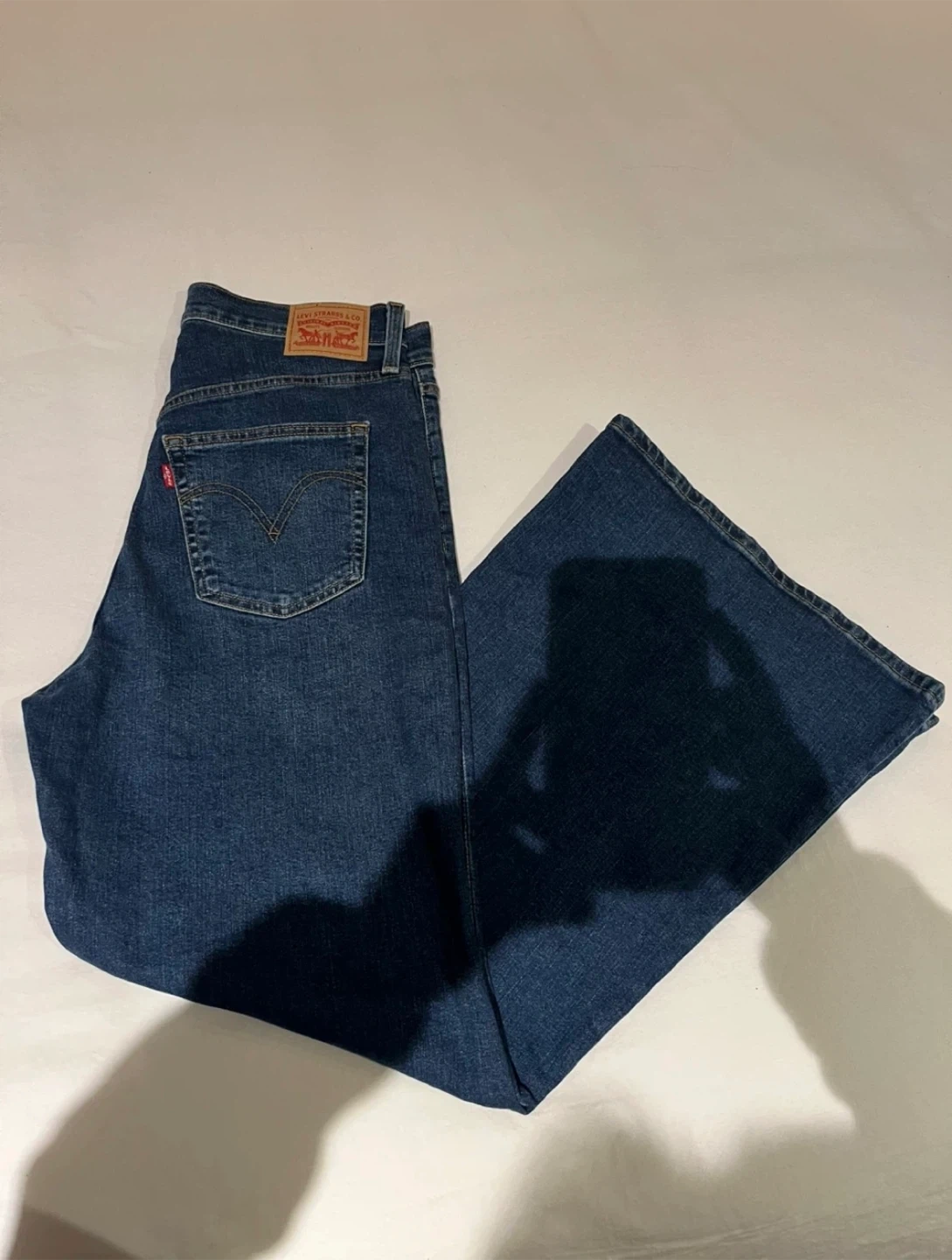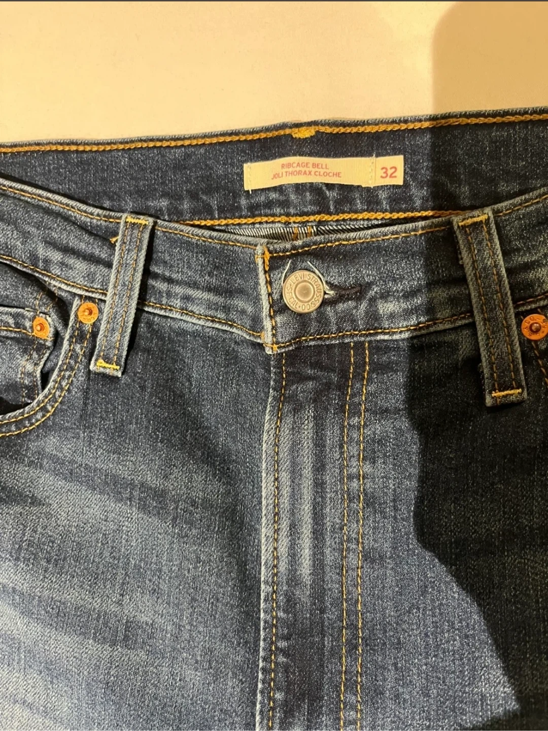 Selling a pair of Brand New Levi's Ribcage Bell jeans in size 32! They're a stylish and comfortable fit for anyone looking to add a bit of flair to their wardrobe. The dark wash denim is versatile and easy to pair with just about anything