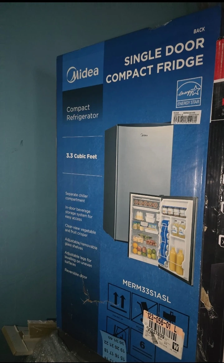 Selling a Midea compact refrigerator. It's a single door model with 3.3 cubic feet of space. It comes with a separate chiller compartment, an in-door beverage storage system, and a clear-view vegetable and fruit crisper. The fridge also has adjustable/removable glass shelves and adjustable legs for levelling on uneven surfaces. It also has a reversible door