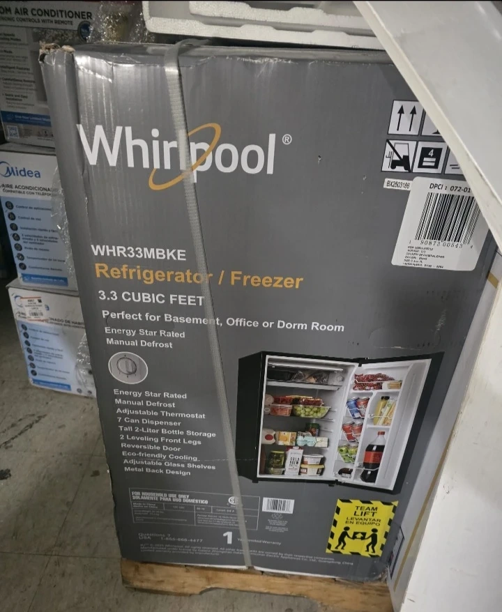 Selling a Whirlpool refrigerator/freezer, perfect for a basement, office, or dorm room! It's 3.3 cubic feet and energy star rated. Key features: - Manual defrost - Adjustable thermostat - 7 can dispenser - Tall 2-liter bottle storage - 2 leveling front legs - Reversible door - Eco-friendly cooling - Adjustable glass shelves - Metal back design