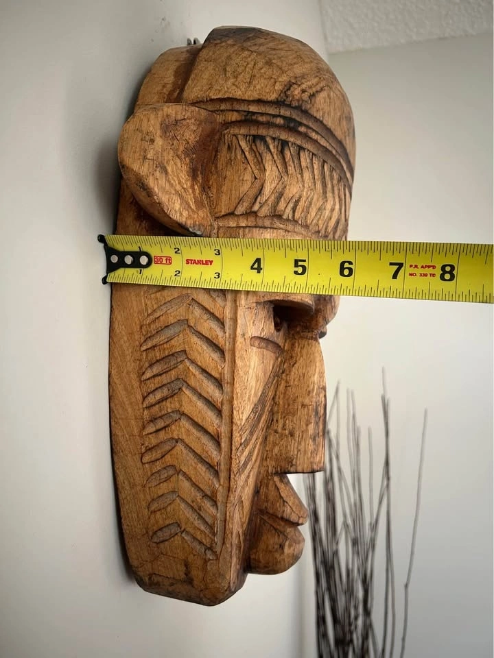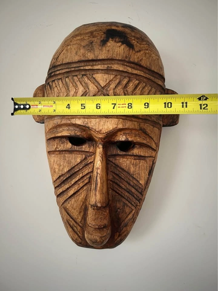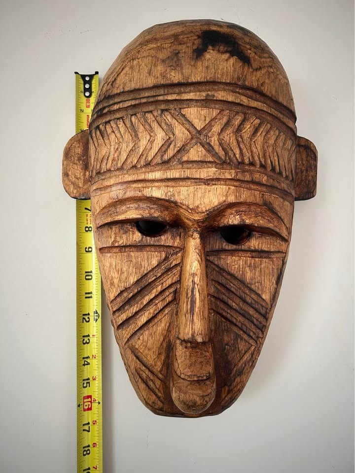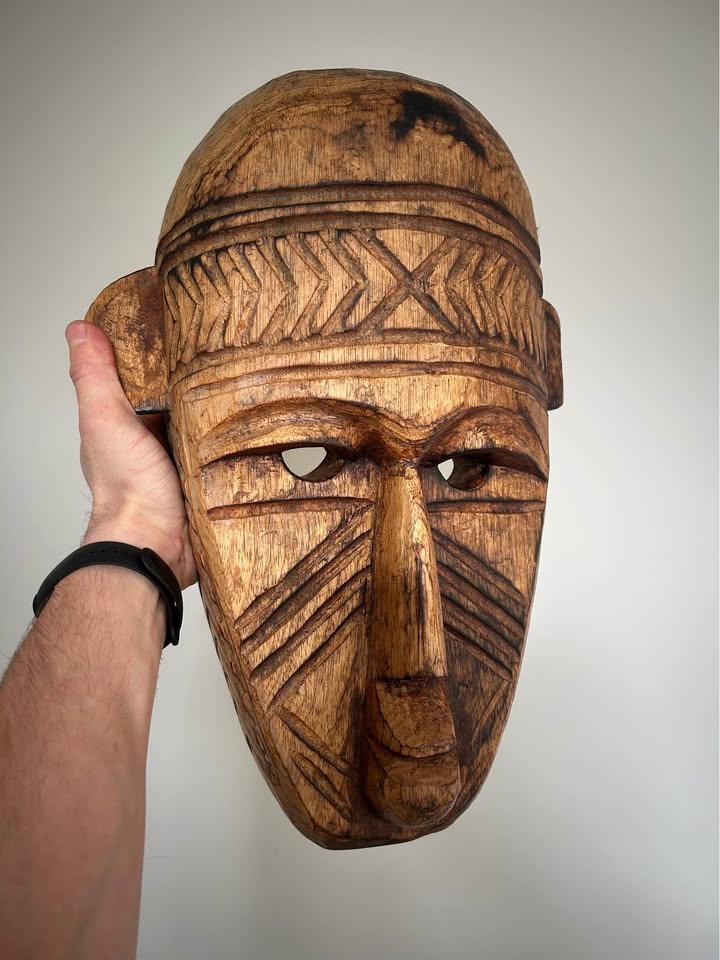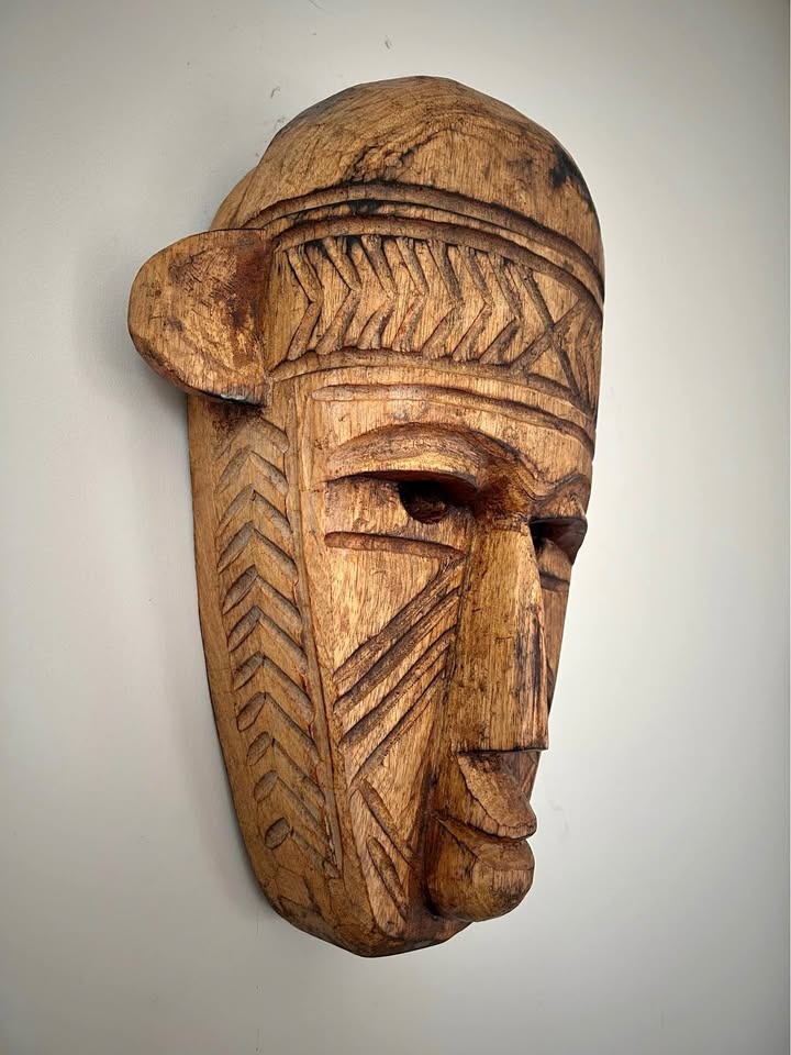 Large hand-carved wooden decorative mask inspired by traditional West African art, particularly the geometric and “primitive” visual language associated with the Bamana (Bambara) and Dogon peoples of Mali. Carved from a single solid piece of wood, featuring bold linear patterns, elongated facial proportions, and strong sculptural presence. This is a contemporary African-style mask created as decorative art rather than a ceremonial ethnographic object. The surface shows intentional texturing, age-style patina, and natural wood variation. Fully hollowed on the reverse and fitted for wall display. A striking statement piece well suited for modern, rustic, or globally inspired interiors, and ideal for collectors of African-inspired décor and hand-carved wooden art. Pick up: Seton area, Calgary. See also my other lots. Open to your questions and suggestions. If necessary, I provide additional photos. These are not new things, so please look carefully at the photos and videos. Sizes are submitted on request and also using a tape measure in the photo. Measurements can be seen in the photos.