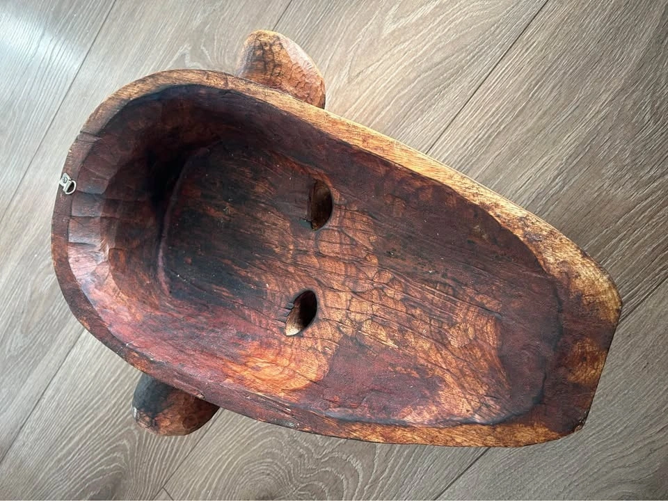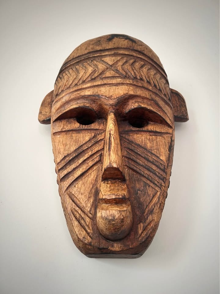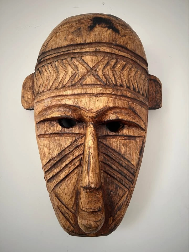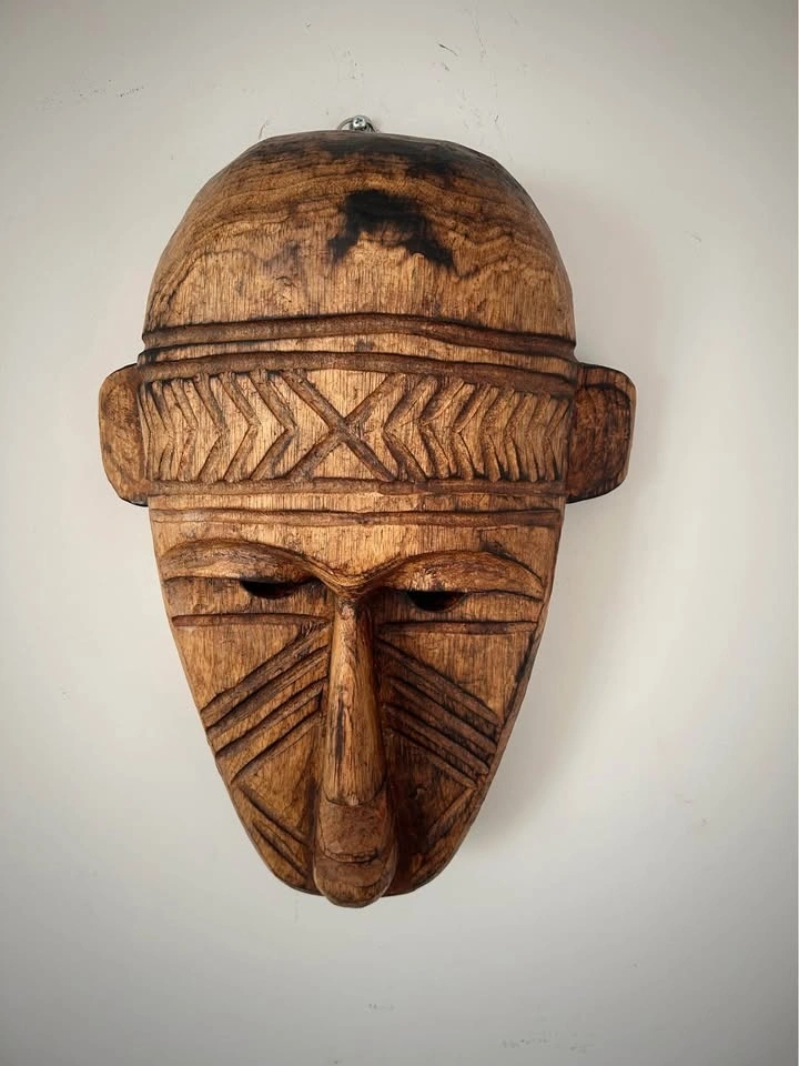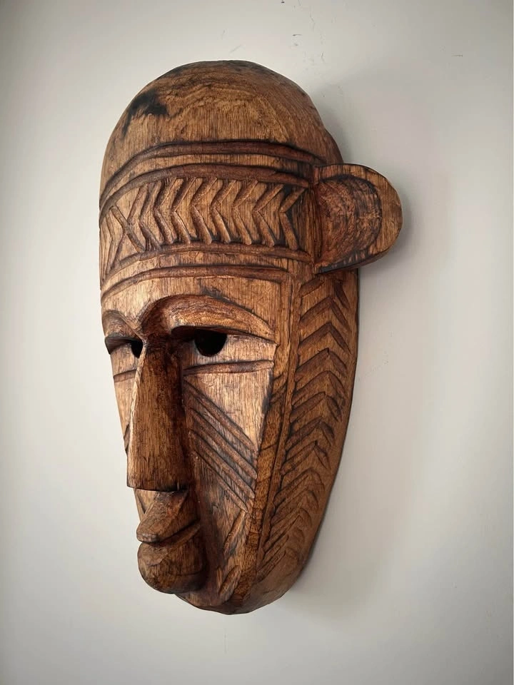 Large hand-carved wooden decorative mask inspired by traditional West African art, particularly the geometric and “primitive” visual language associated with the Bamana (Bambara) and Dogon peoples of Mali. Carved from a single solid piece of wood, featuring bold linear patterns, elongated facial proportions, and strong sculptural presence. This is a contemporary African-style mask created as decorative art rather than a ceremonial ethnographic object. The surface shows intentional texturing, age-style patina, and natural wood variation. Fully hollowed on the reverse and fitted for wall display. A striking statement piece well suited for modern, rustic, or globally inspired interiors, and ideal for collectors of African-inspired décor and hand-carved wooden art. Pick up: Seton area, Calgary. See also my other lots. Open to your questions and suggestions. If necessary, I provide additional photos. These are not new things, so please look carefully at the photos and videos. Sizes are submitted on request and also using a tape measure in the photo. Measurements can be seen in the photos.