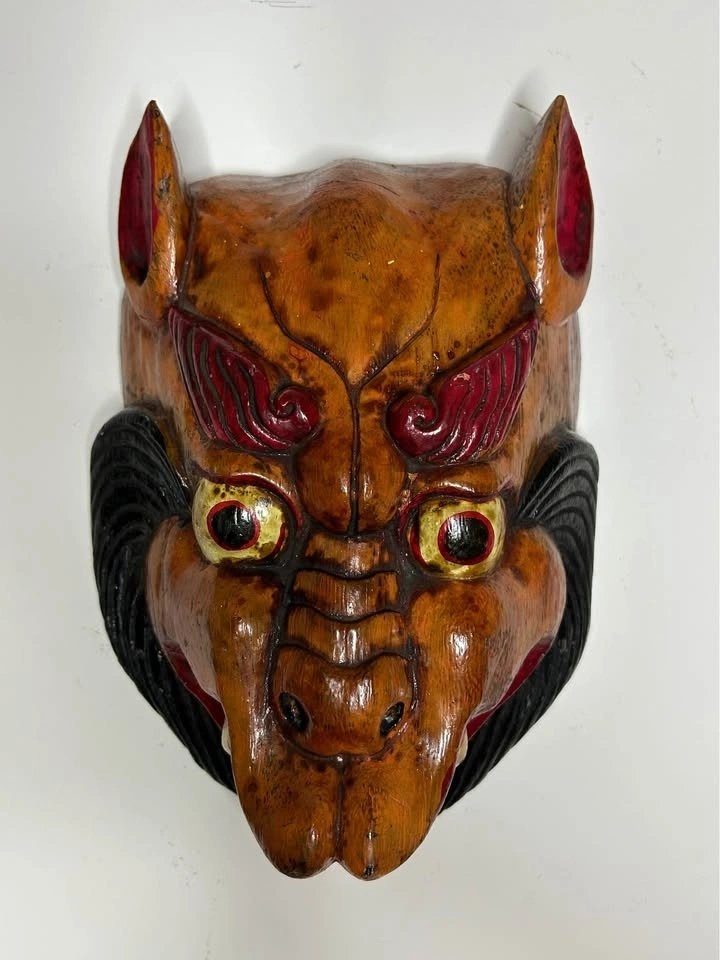 Decorative vintage wooden wall mask depicting a stylized Asian guardian / demon figure. Hand carved from solid wood and finished with traditional painted and lacquered details, featuring expressive eyes, horned form, and dramatic facial expression.