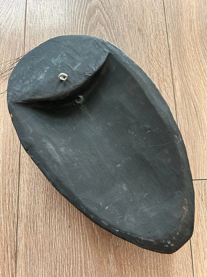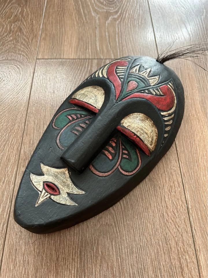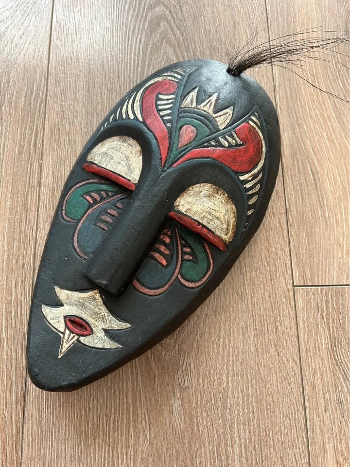 Hand-carved wooden wall mask featuring a dramatic elongated form, painted geometric motifs, and a natural hair tuft accent at the top. Finished in deep black with hand-applied red, cream, and green detailing, this piece has strong visual contrast and expressive character.