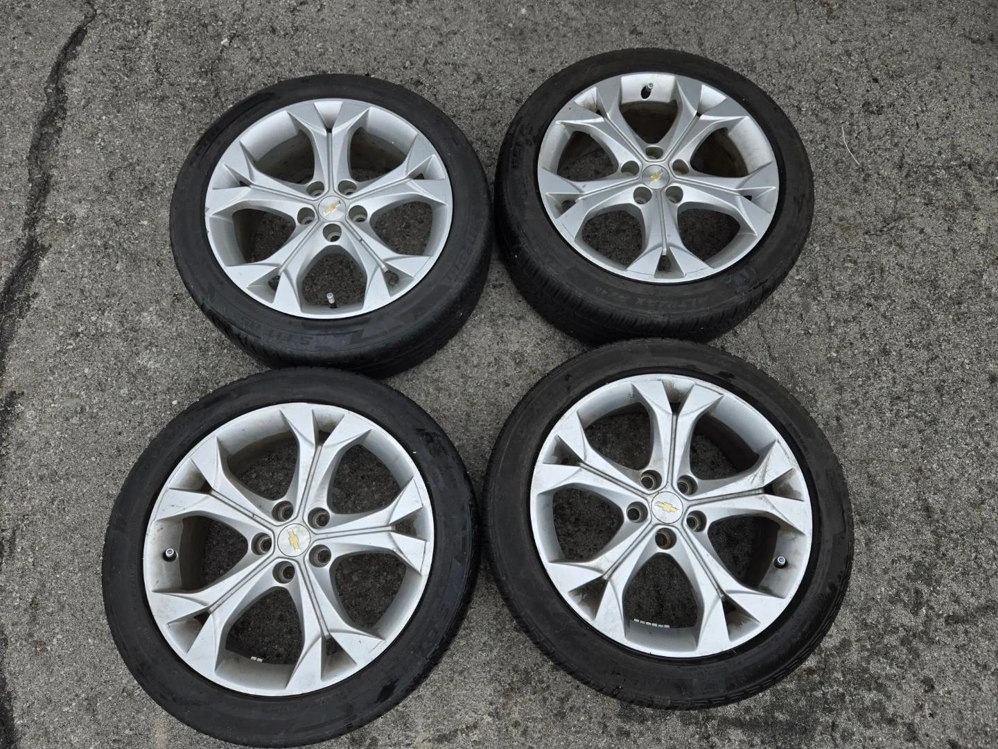 Selling a set of four tires and rims that came off a Chevrolet Cruze car. The tires are size 205/50R17. These are replacement tires and are ready to be used! *ALL SEAONS*