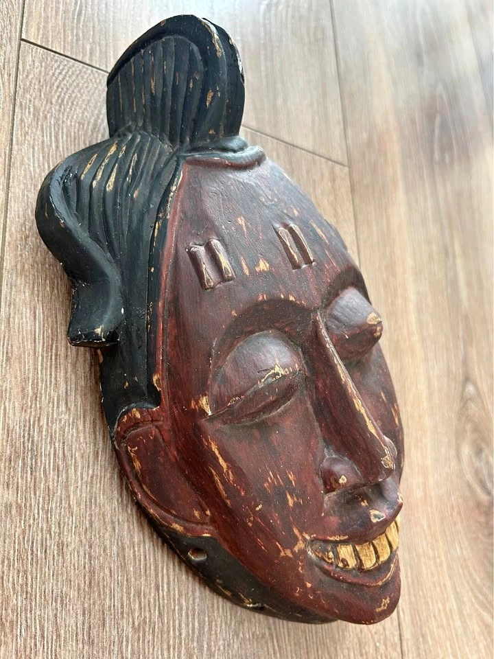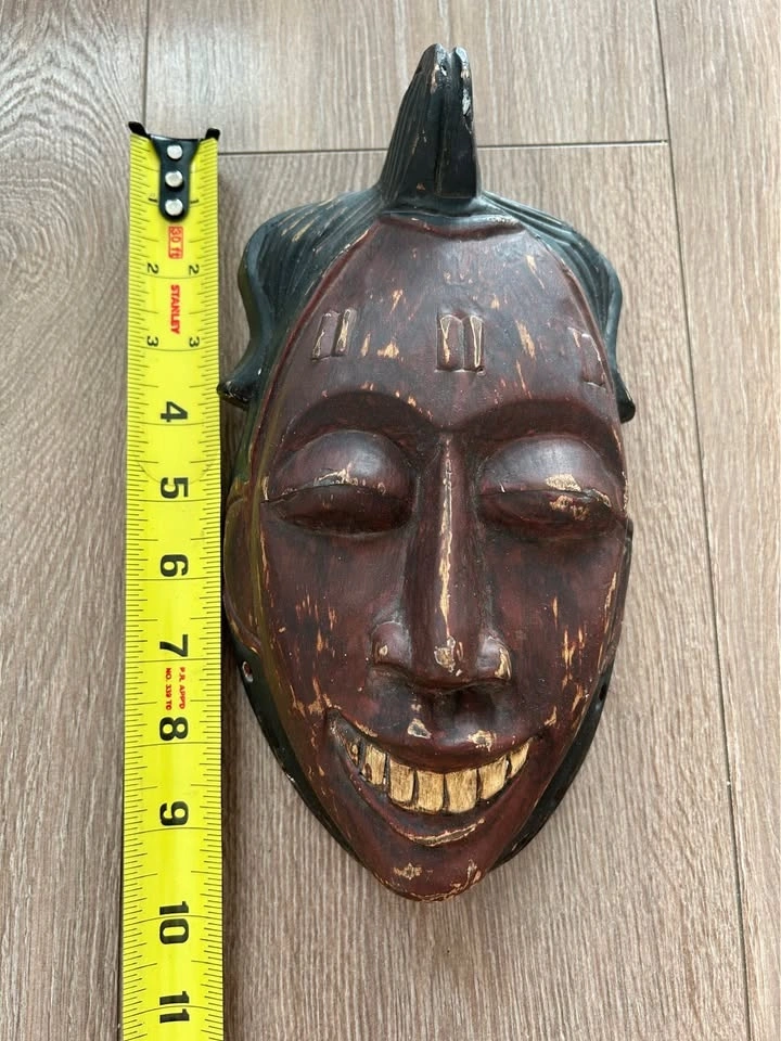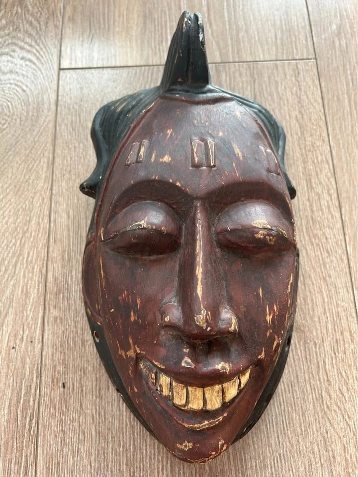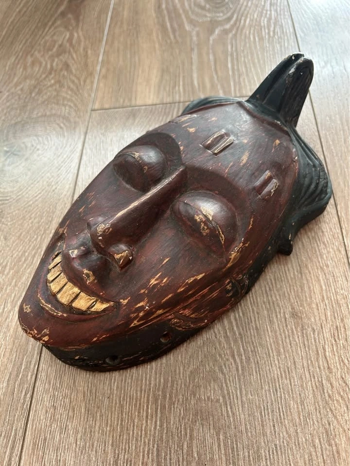 This mask was produced as decorative art rather than a ceremonial object, typical of mid-to-late 20th century export carvings inspired by traditional tribal aesthetics. The hand-carved details, expressive teeth, and weathered patina make it a striking wall accent for collectors who appreciate raw, timeworn décor.