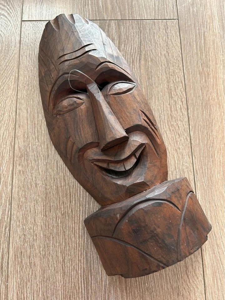 Vintage hand-carved wooden wall mask featuring a warm dark wood tone and expressive facial form. This piece shows confident carving with angular eyes, elongated nose, and subtle smile, giving it strong character and visual depth. The faceted carving style highlights the natural wood grain and adds a sculptural, folk-art feel.