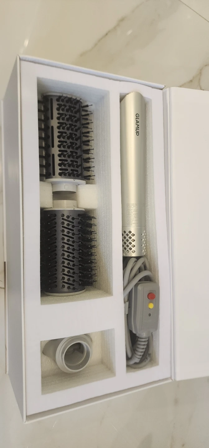Selling a almost new GLAMUP FlexiAir 5-in-1 Hot Air Brush! Used 3 times, has a rated power of 1100W and is perfect for creating a variety of hairstyles. The box includes all components and accessories. Get salon-quality results at home with this amazing hot air brush!