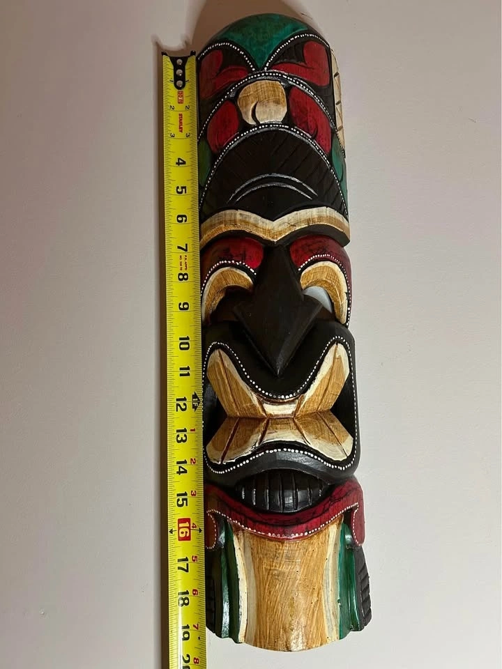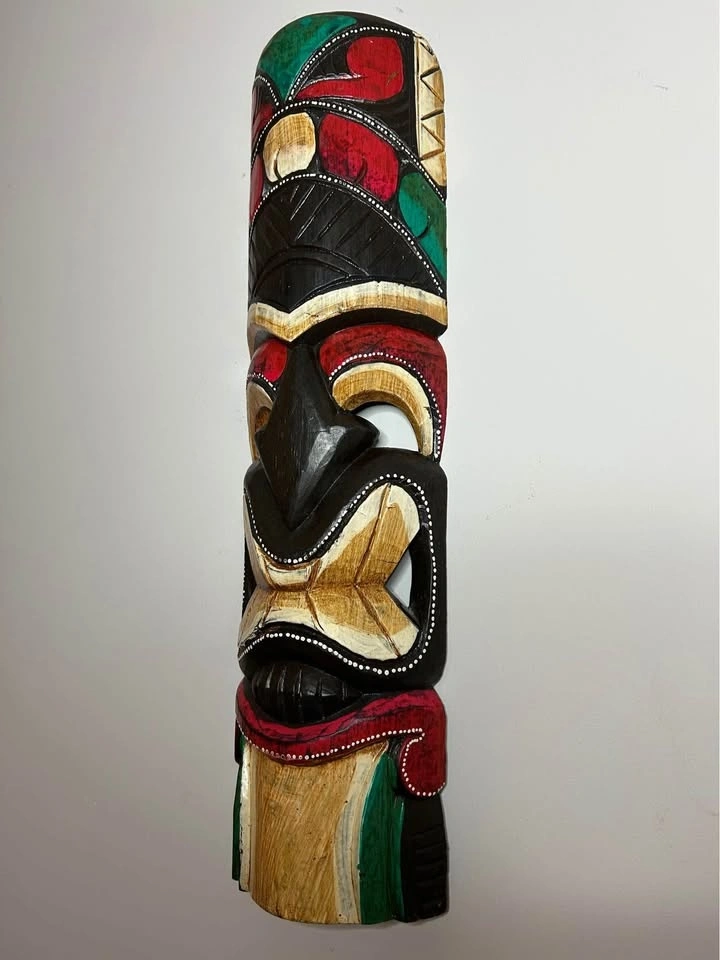 Featuring bold carved details and hand-painted accents, this piece is intended as decorative art, inspired by traditional island motifs rather than representing a specific cultural artifact.