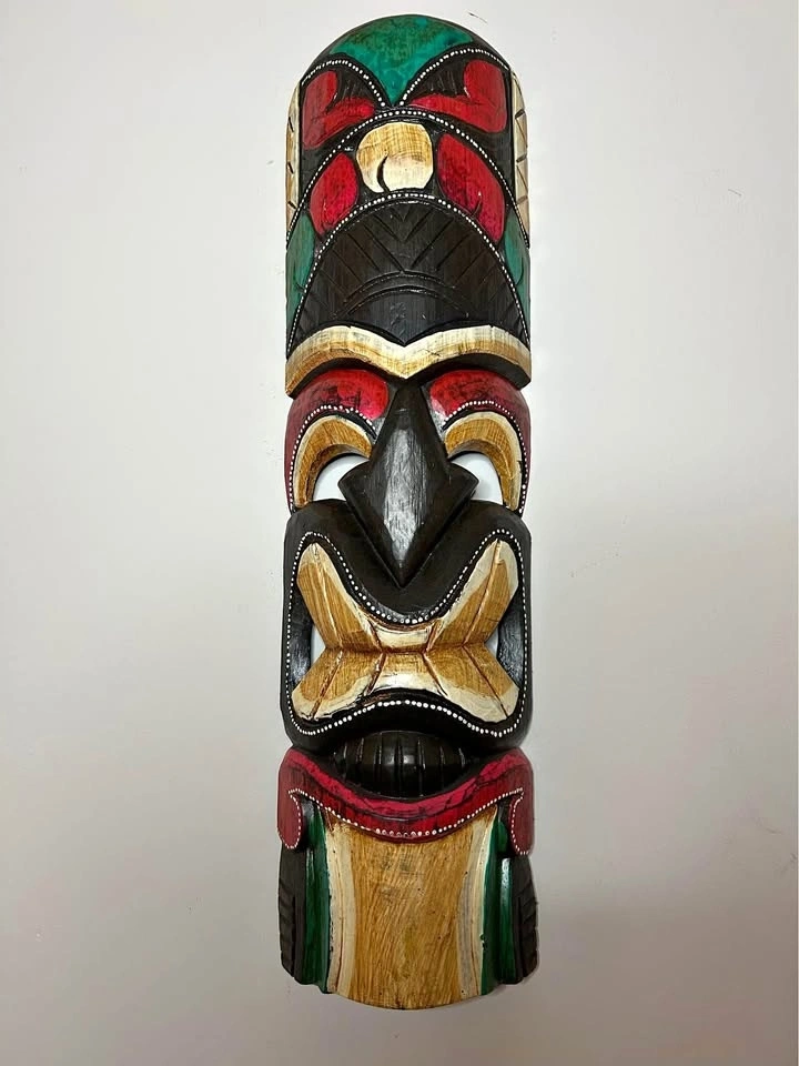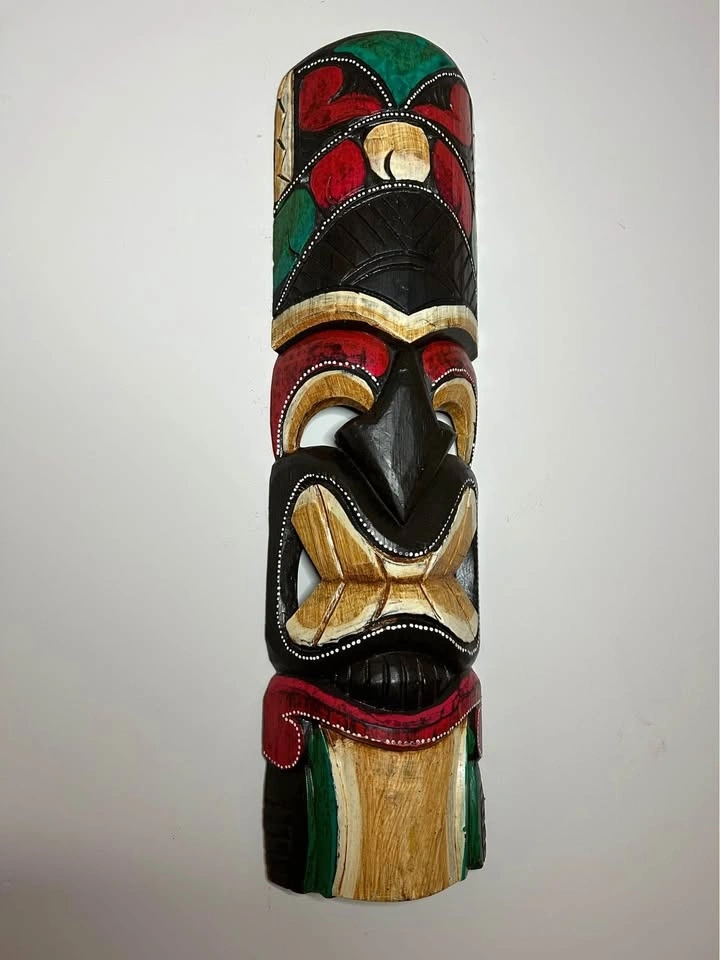 Featuring bold carved details and hand-painted accents, this piece is intended as decorative art, inspired by traditional island motifs rather than representing a specific cultural artifact.