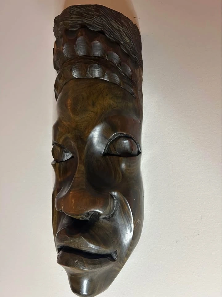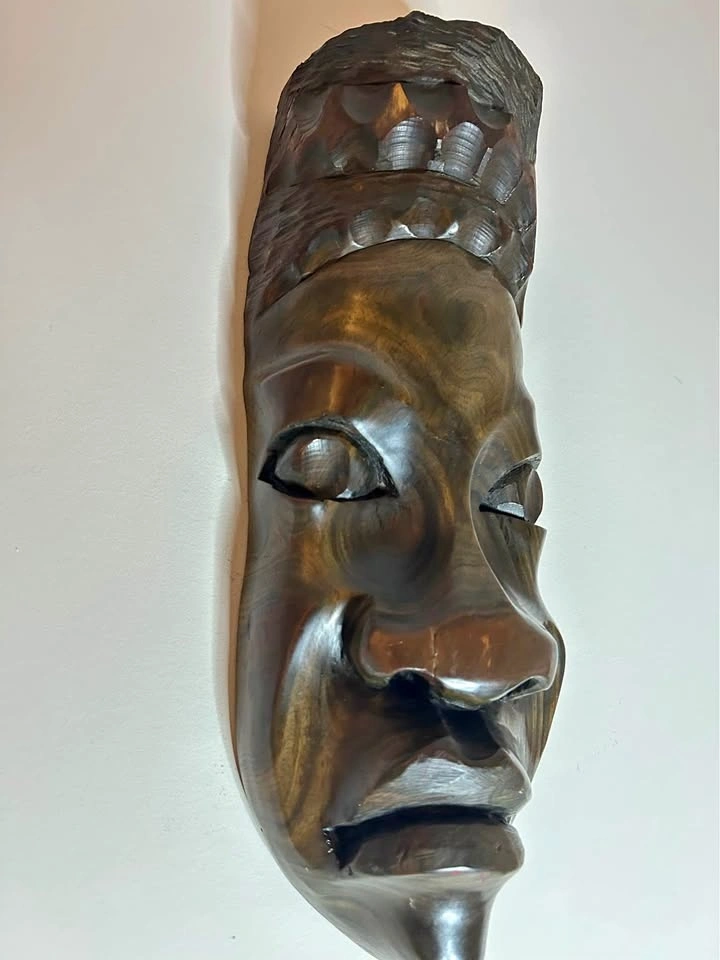 Striking hand-carved wooden wall mask in a classic African tribal style. Crafted from a solid piece of hardwood, this mask features deep sculptural carving, expressive facial proportions, and a rich dark patina developed over time.