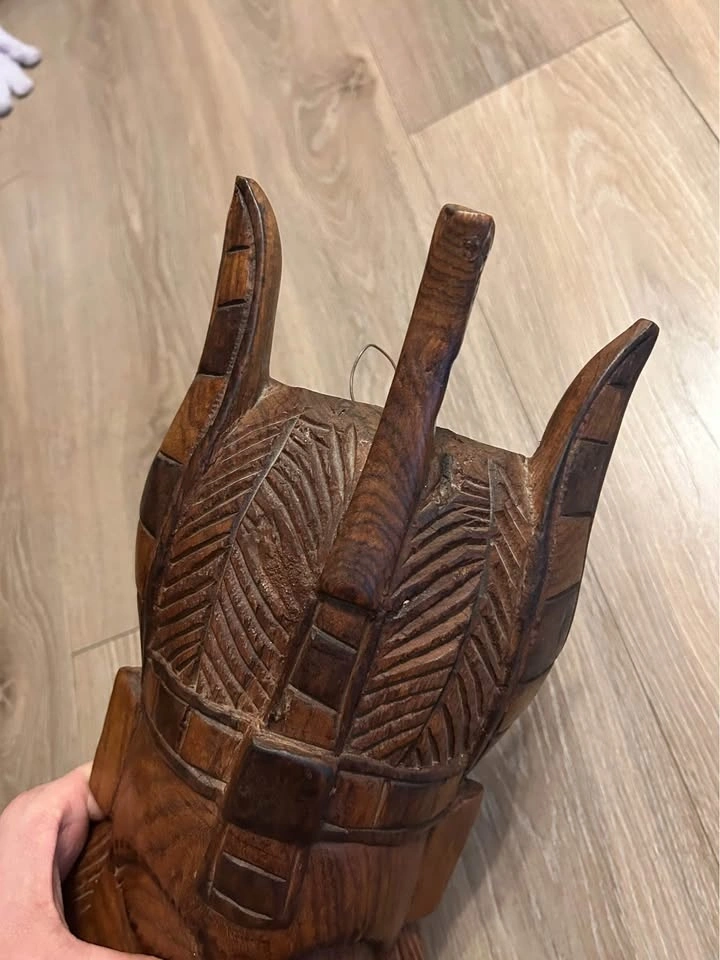 • Artistry: Detailed geometric patterns carved into the "crown" and facial borders.