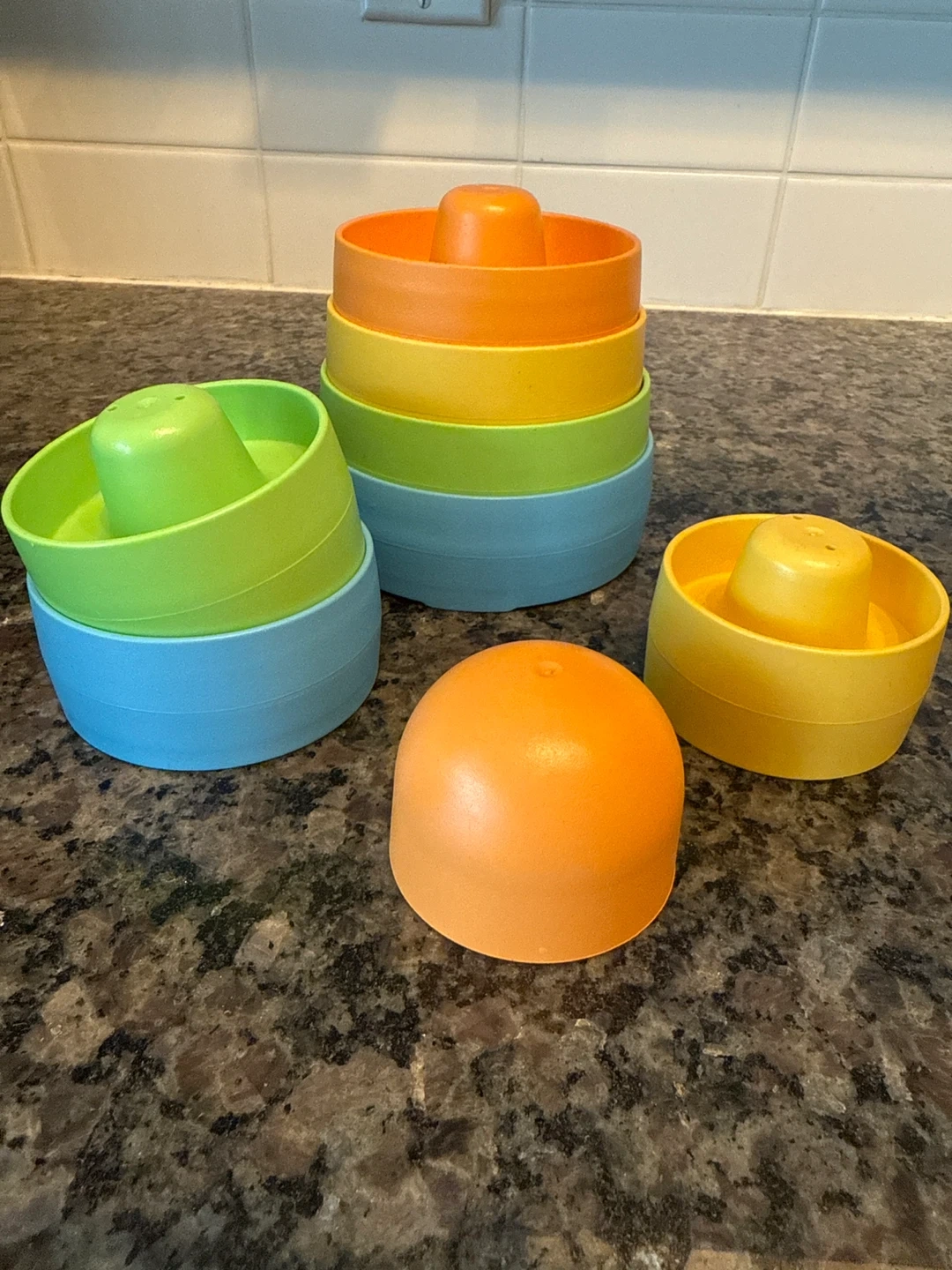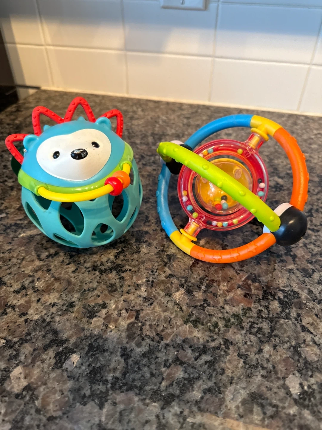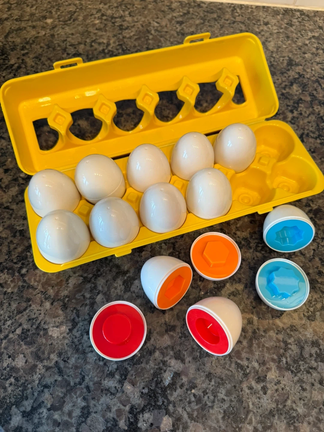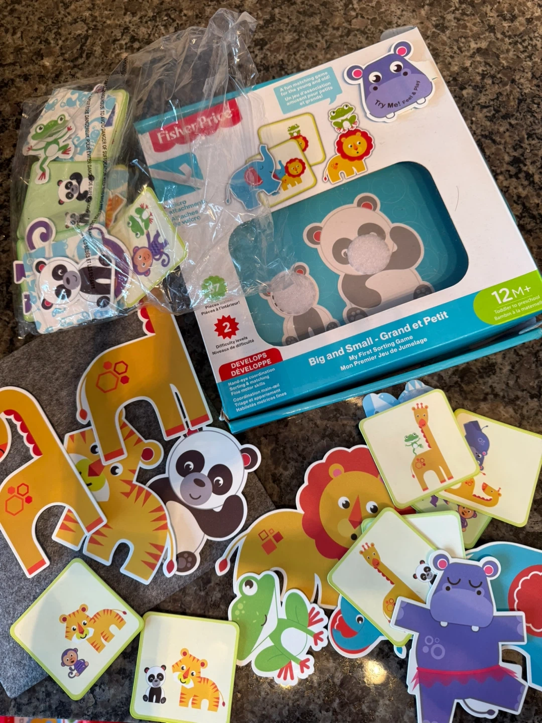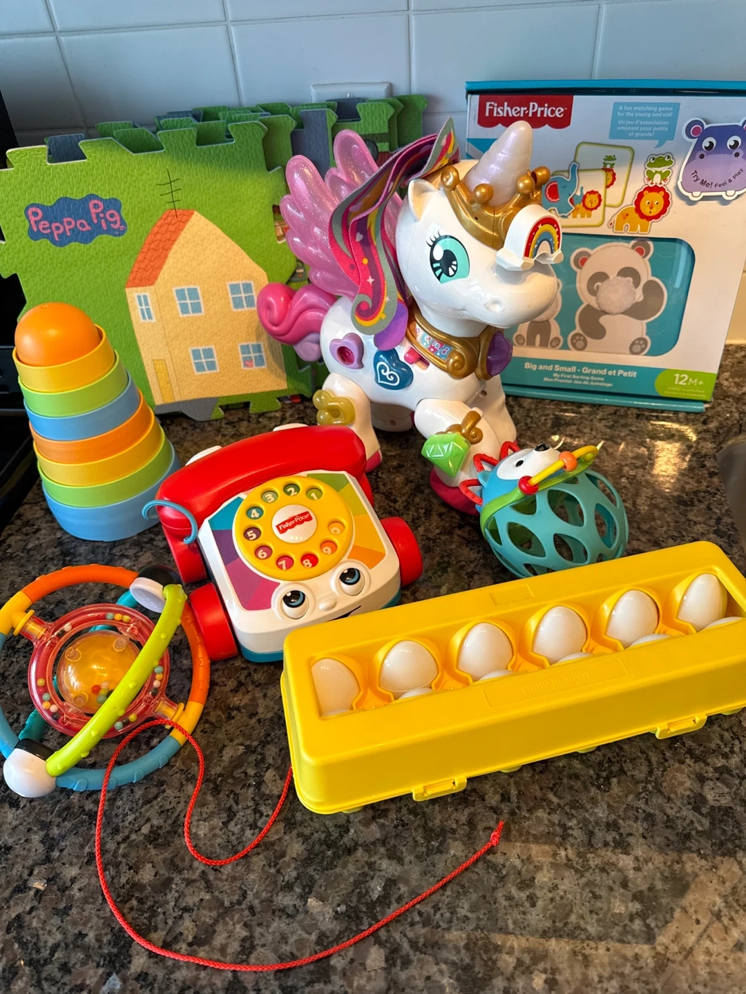 Selling a bundle of kids' toys! Includes a Fisher-Price puzzle game, a Peppa Pig play mat, a Charm Unicorn English/French, the beloved retro fisher price telephone! Great for toddlers and young children, excellent activities perfect for hand eye coordination.*Stacking tower, and egg carton not included!