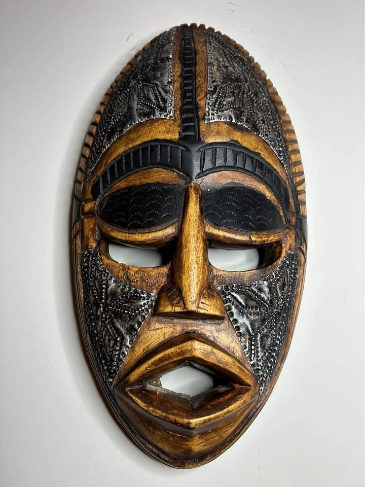 Striking vintage African wall mask crafted from solid carved wood and decorated with metal inlay and embossed details. This piece reflects classic West African design influences, commonly associated with Ivory Coast decorative traditions.