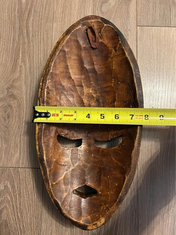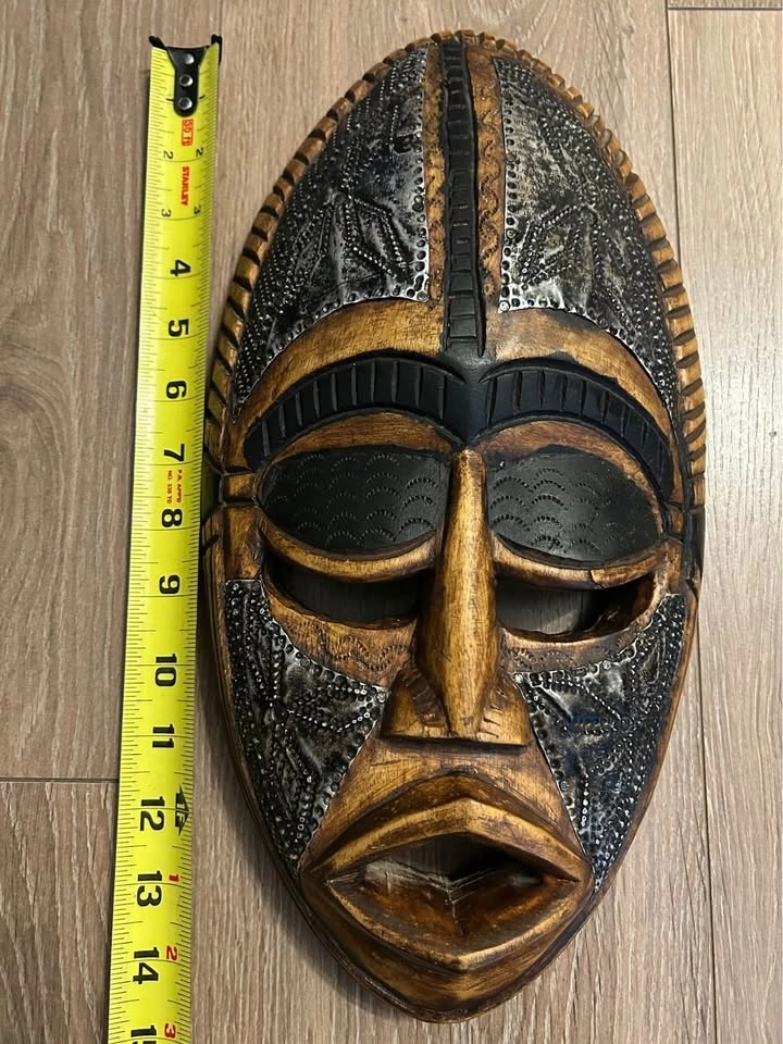 The elongated face, bold geometric features, and contrasting wood-and-metal textures give this mask a strong visual presence. Designed as wall décor rather than a ceremonial object, it was likely produced in the late 20th century for interior decoration and export.