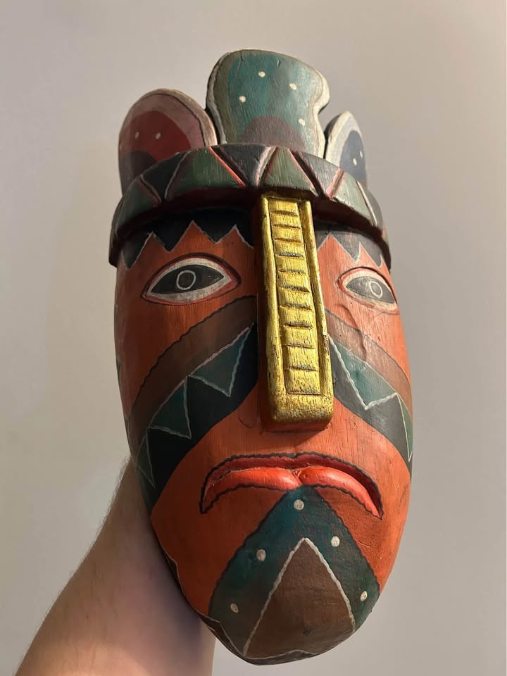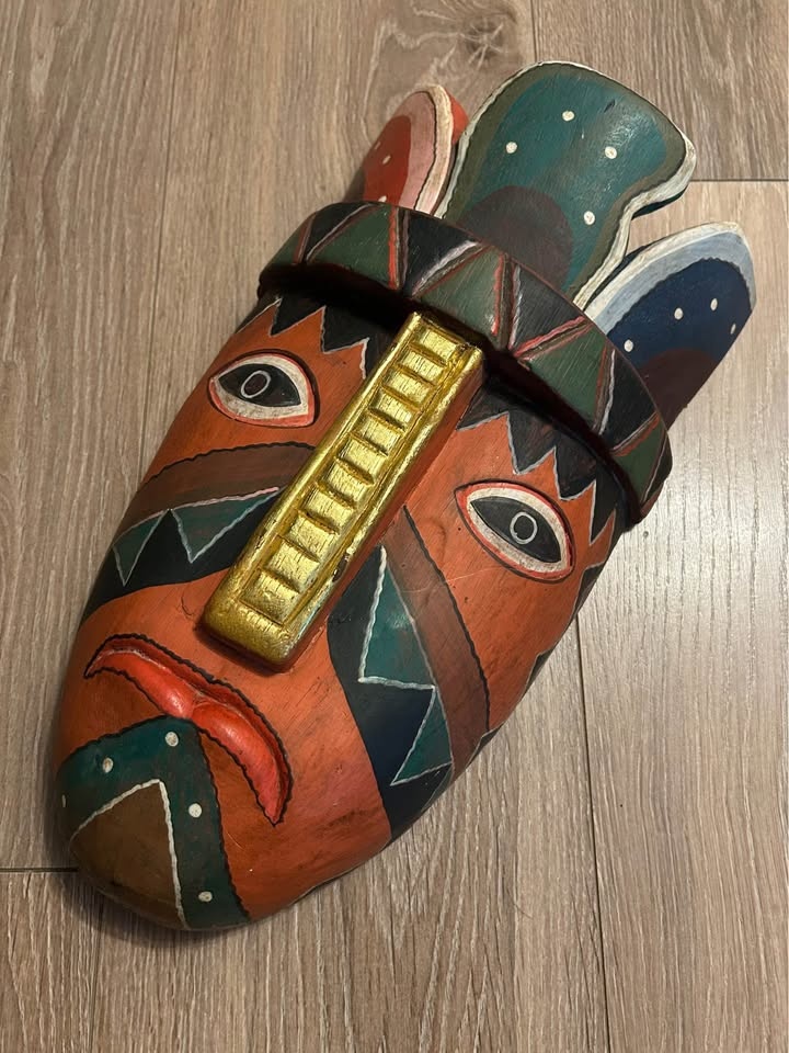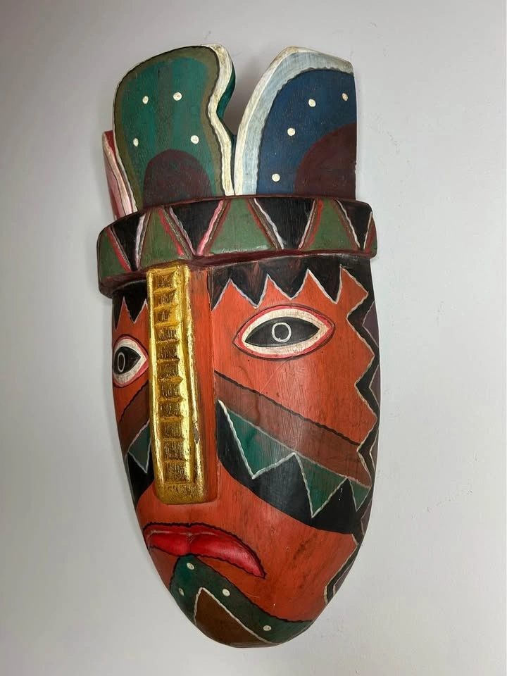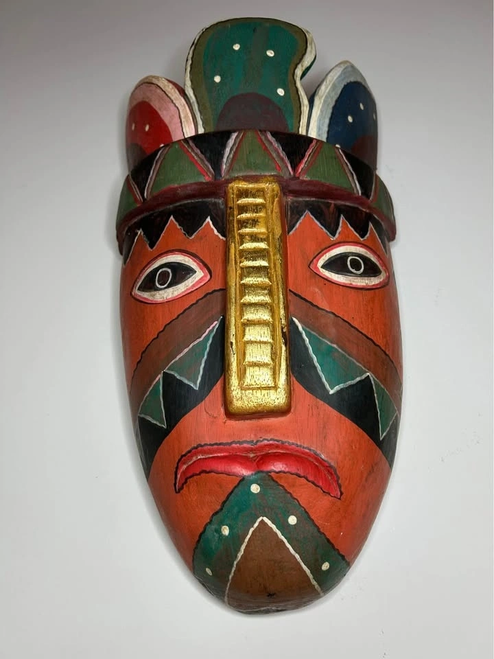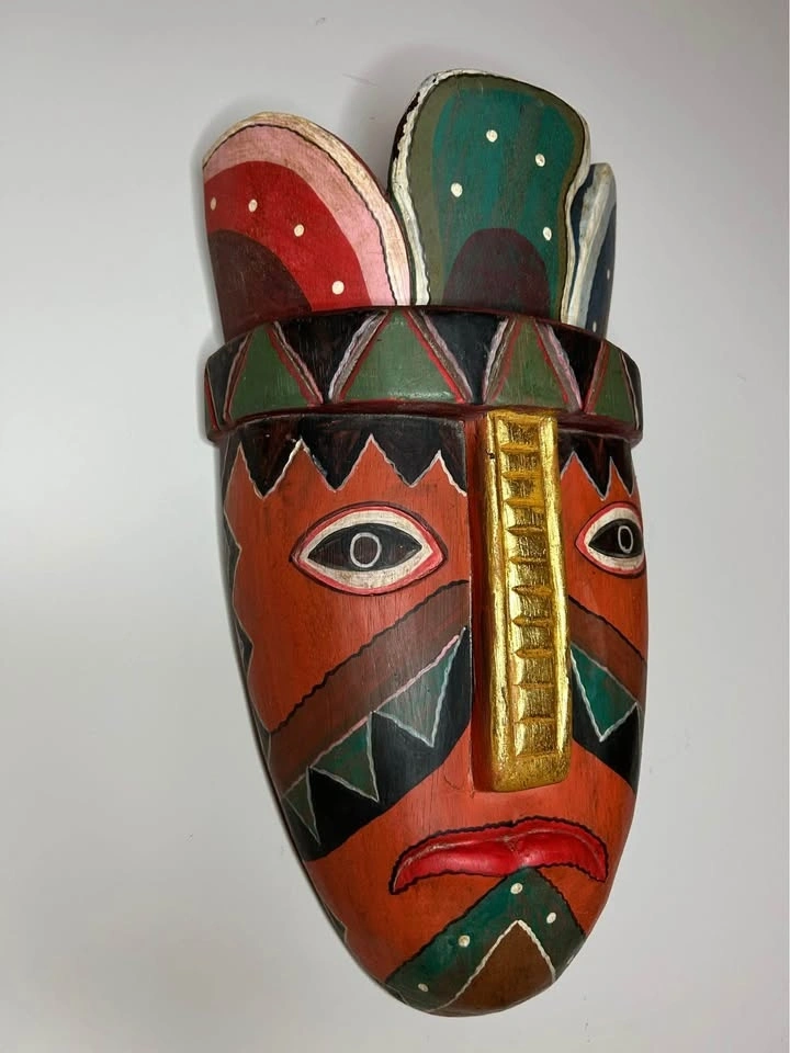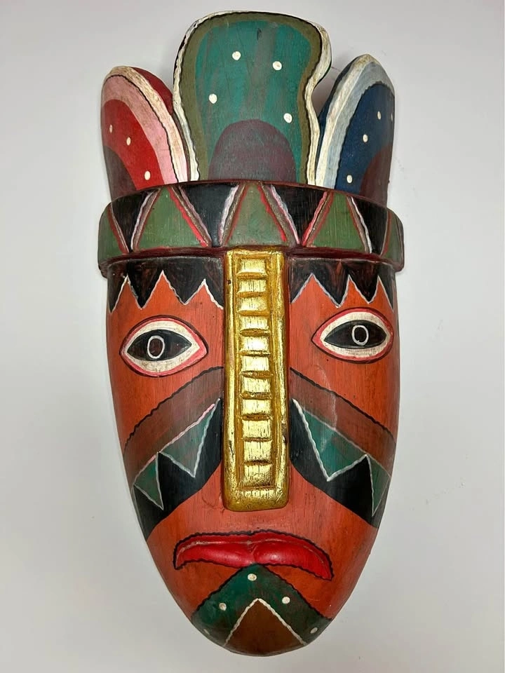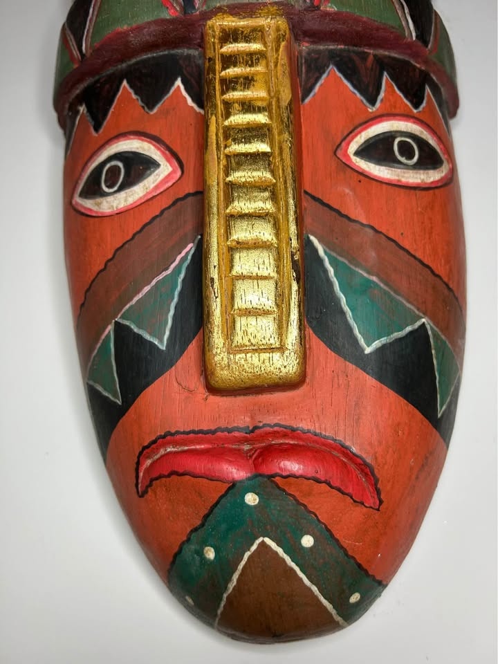 Striking vintage tribal-style wooden wall mask, hand carved and hand painted with bold geometric patterns and rich earthy tones. This expressive mask features a distinctive raised gold-tone nose detail and a sculptural crown-like top, giving it strong visual presence and character.