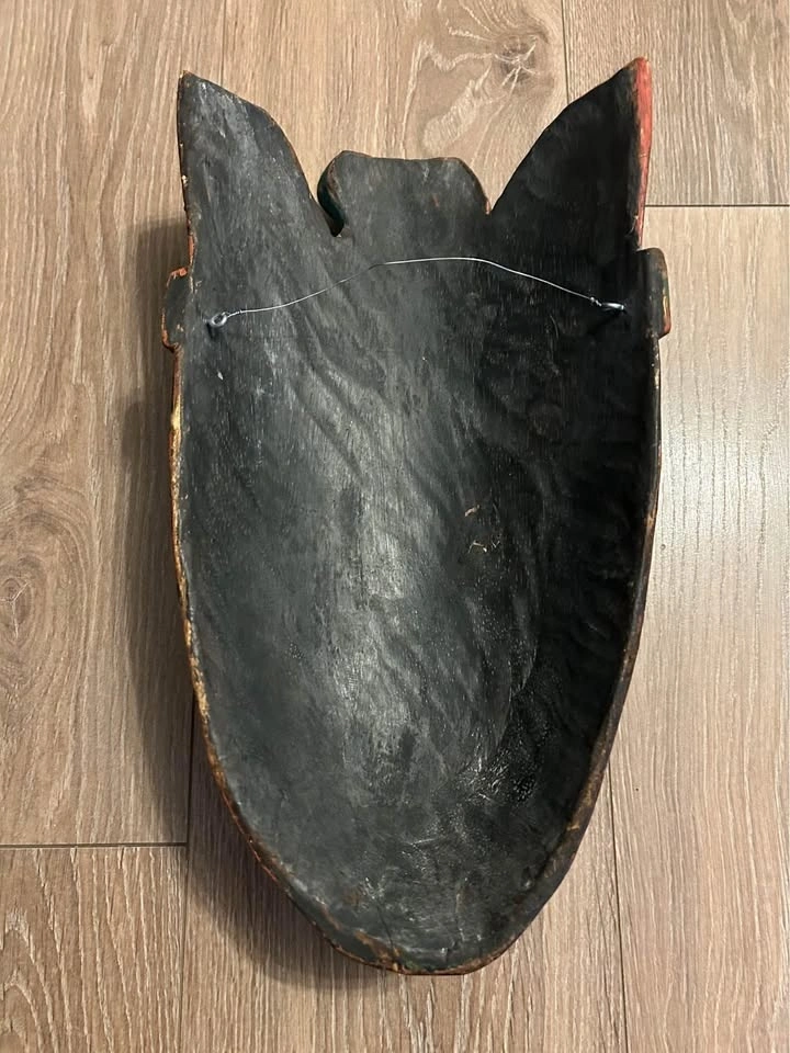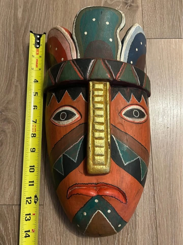 Crafted from solid wood, this piece reflects classic mid-century ethnic décor aesthetics rather than a ceremonial artifact. Designed purely as decorative wall art, it works beautifully as a statement piece in eclectic, boho, or global-inspired interiors. Clean carving, balanced symmetry, and layered colors make it especially appealing to collectors of vintage tribal and ethnic décor.