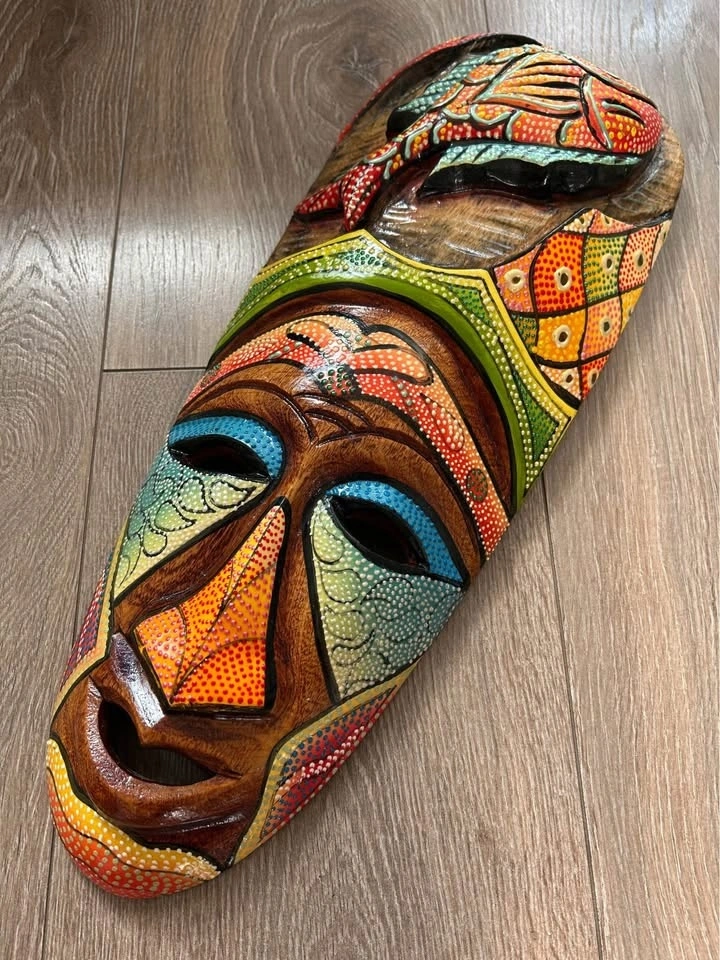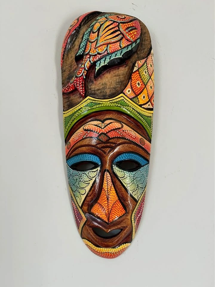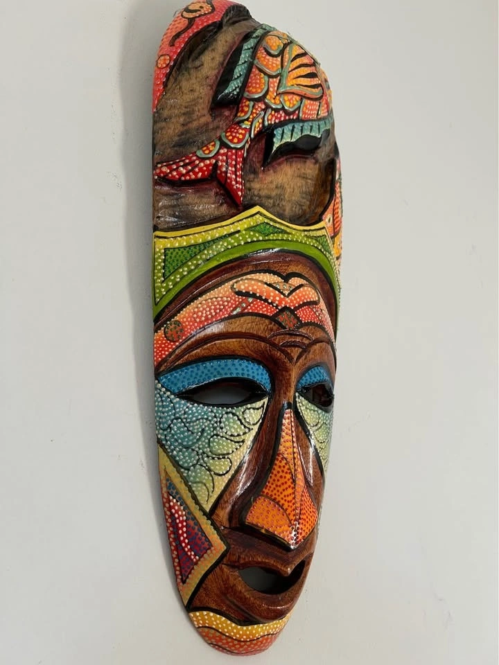 Hand-Carved Wooden Wall Mask Colorful Dot Painted 16” tall