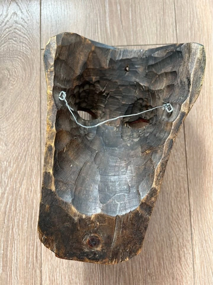 This mask shows significant age-related wear, including surface abrasion, paint loss, small chips, and visible tool marks. Offered AS IS, exactly as shown. The wear enhances its raw folk-art character and makes it especially appealing for collectors of rustic, primitive, or ethnographic-style decor.