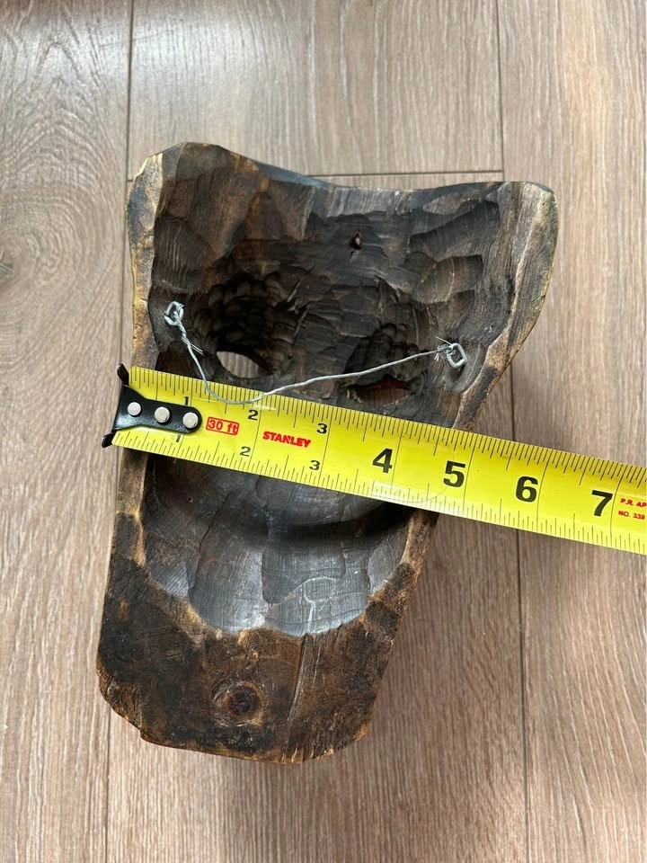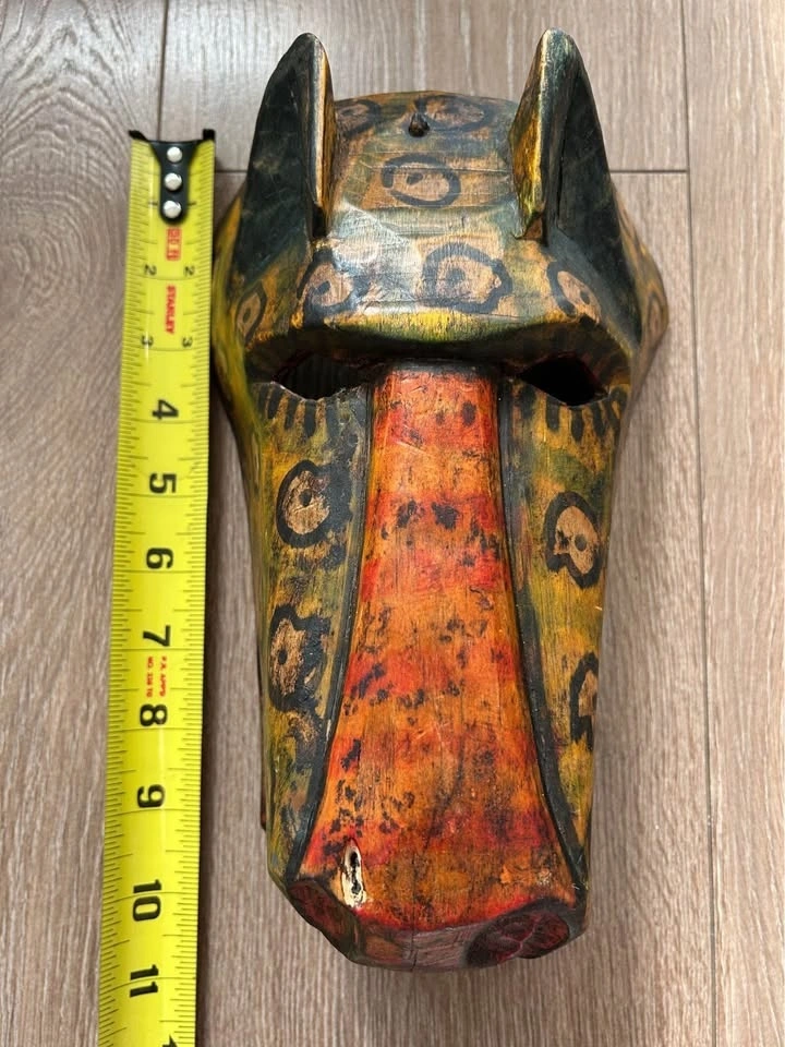 This mask shows significant age-related wear, including surface abrasion, paint loss, small chips, and visible tool marks. Offered AS IS, exactly as shown. The wear enhances its raw folk-art character and makes it especially appealing for collectors of rustic, primitive, or ethnographic-style decor.