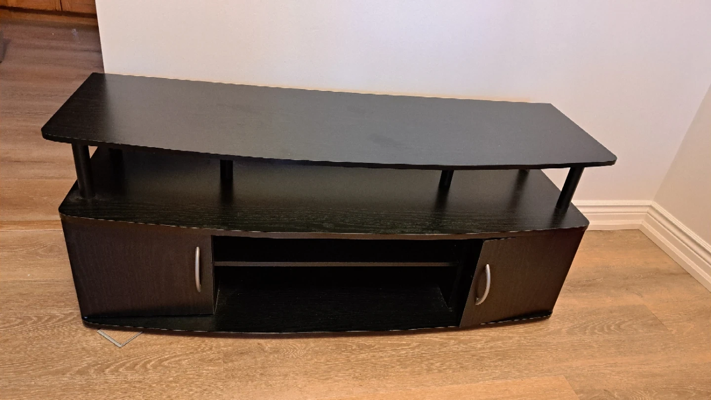 Selling a black TV stand with a sleek design. It features a spacious top surface for your TV and media devices, along with storage cabinets to keep your living room organized. The stand is in great condition and ready for a new home!